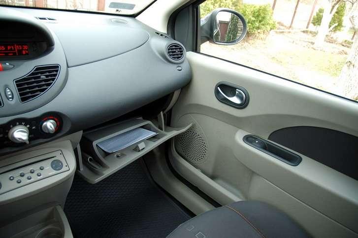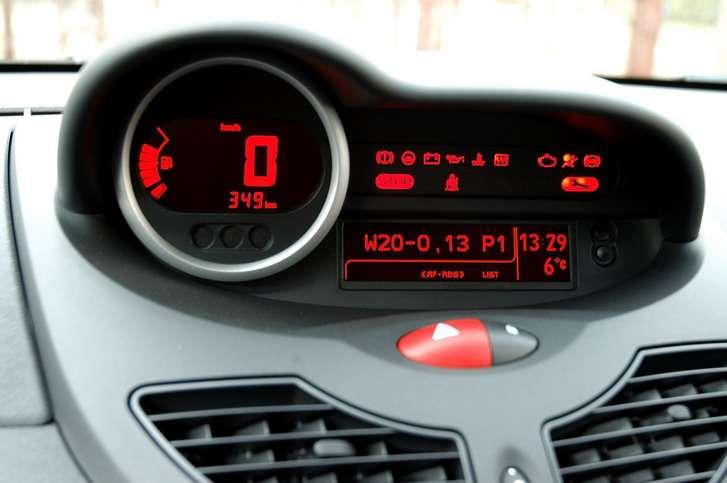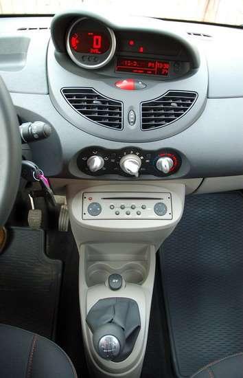 Duży rozstaw osi przekłada się też na obszerność wnętrza. Przy kompaktowych wymiarach samochodu inżynierom udało się osiągnąć naprawdę sporo. Wnętrze jest proste w formie i wykończeniu, ale ergonomiczne. Może nieco zbyt kontrowersyjny jest układ deski rozdzielczej – całkiem jak np. w małych „trojaczkach" PSA i Toyoty. Przed oczami kierowcy wyrasta samotnie okrągły obrotomierz, a cały zestaw pozostałych wskaźników powędrował na środek kokpitu, w formie kolejnej „narośli". Skąd u projektantów przekonanie, że takie rozwiązanie podoba się użytkownikom – tego się chyba nie dowiemy, w każdym razie większość osób oglądających z zaciekawieniem nowe Twingo zdecydowanie bardziej wolałaby zegary umieszczone przed kierowcą i w bardziej klasycznym stylu. Mimo to zegary są szczęśliwie dość czytelne, ale znacznie wygodniejszym byłoby umieszczenie choćby i małego, dodatkowego wyświetlacza prędkościomierza wraz z obrotomierzem. Reszta przyrządów nie wywołuje większych kontrowersji, ani nie sprawia problemów przy użytkowaniu – ot po prostu standardowe rozwiązania, charakterystyczne dla Renault. Dobrze, że wnętrze utrzymano w dwóch odcieniach kolorystycznych, a plastiki – choć twarde, to robią wrażenie dobrych jakościowo i odpowiednio spasowanych.