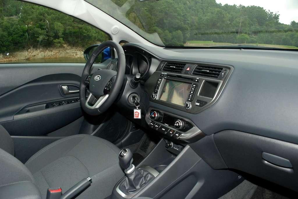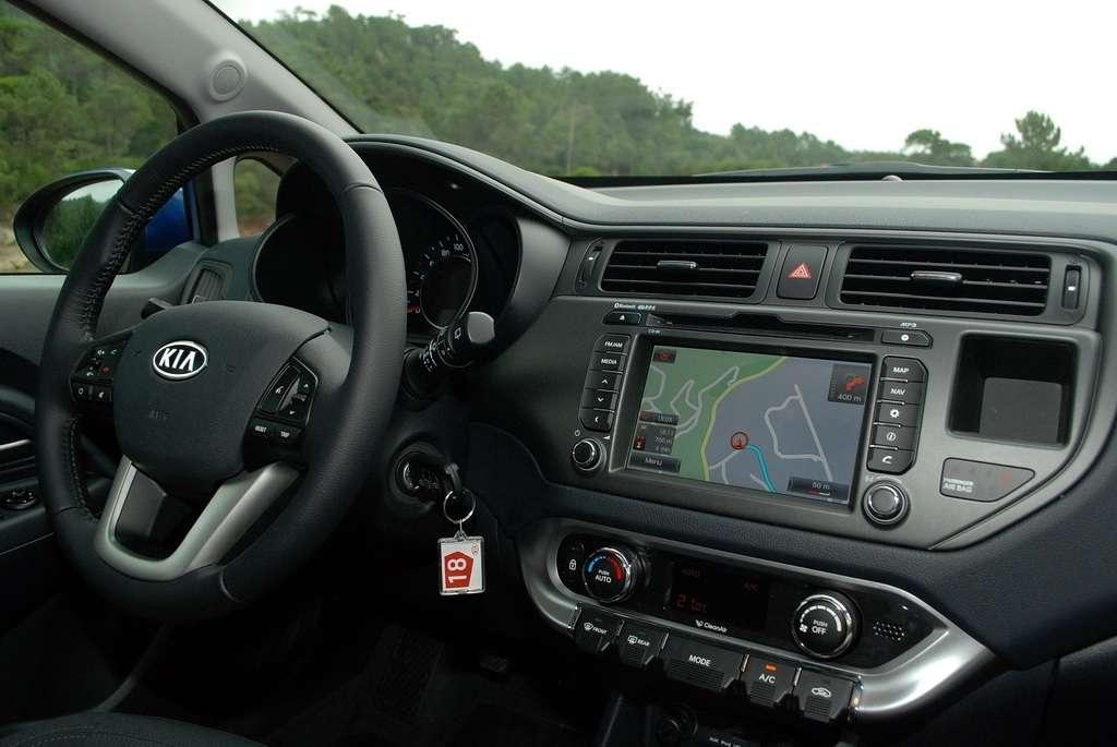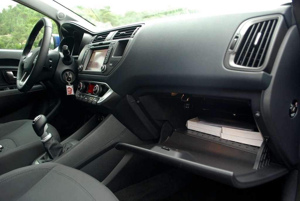 Wnętrze Rio ma również układ charakterystyczny dla marki Kia. Trzywskaźnikowy zestaw zegarów czy poziomy układ deski rozdzielczej widzieliśmy już w innych modelach. Nowością są przełączniki na konsoli środkowej, zgrabnie zintegrowane z ogrzewaniem i sterujące różnymi dodatkowymi funkcjami. Środek, w zależności od wersji wyposażenia, może mieć trzy kolory – brązowy, czarny i pustynny beżowy.