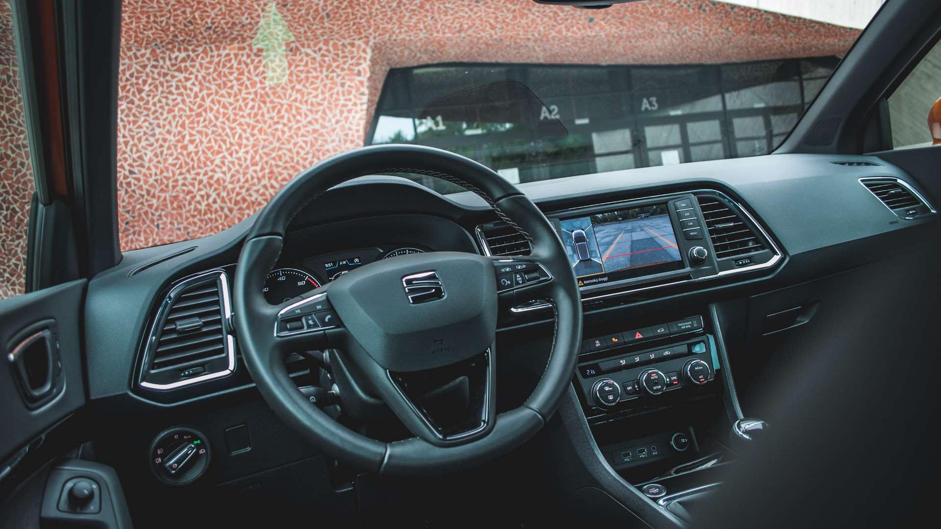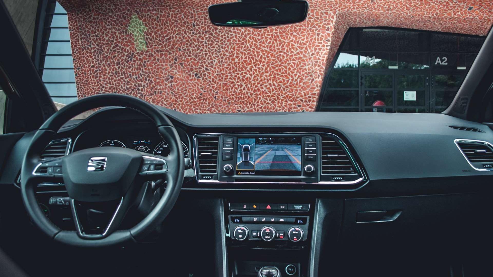 Na przykład taka kamera cofania. W oparciu o obraz z kilku kamer rozmieszczonych naokoło samochodu, na ekranie centrum multimedialnego pojawia się trójwymiarowy obraz samochodu i jego otoczenia. Możemy spojrzeć z boku, z przodu, z tyłu, z góry zmienić kąt widzenia - zupełnie, jak w BMW Serii 7, tyle, że kamery Seata nie obsługujemy gestami. Obraz jest oczywiście lekko zniekształcony, ale dostosowany tak, by przede wszystkim zgadzały się odległości. Parkowanie ułatwia też system Park Assist z funkcją autonomicznego parkowania równoległego i prostopadłego.