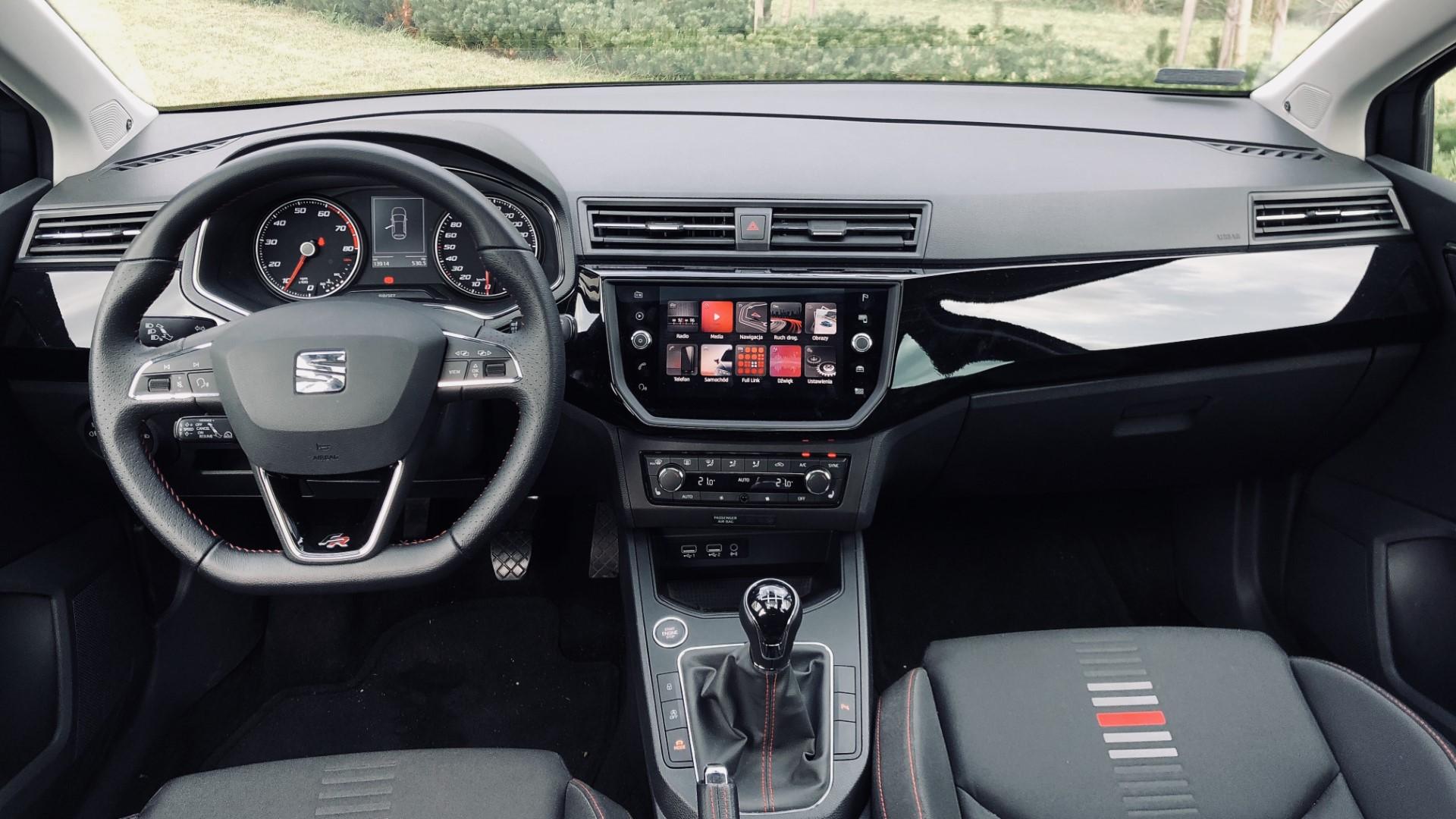 Całe wnętrze Ibizy FR sprawia jednak wrażenie dość taniego i plastikowego. Szczególnie nie podoba mi się olbrzymi panel dekoracyjny wykończony czarnym lakierem fortepianowym – nie nadążałem z wycieraniem kurzu, bo przyciąga go jak magnes. Szczęśliwie Seat naprawił swój błąd i aktualnie ten panel w wersji FR wykończony jest skórą z czerwonym przeszyciem. Dobra zmiana!