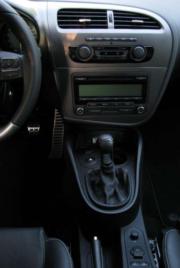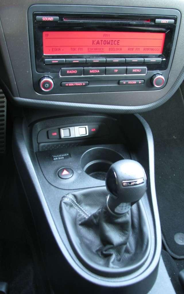 Leon w wersji Cupra nie bije po oczach wydumanymi spojlerami czy innymi elementami sugerującymi sportowe przeznaczenie. Napisy Cupra i duże R na tylnej klapie, atrapie chłodnicy i zderzaku to wyraźne, ale dość dyskretne wyróżniki. Znacznie mocniej zaznaczono sportowy styl we wnętrzu. Pod względem funkcjonalnym Leon broni się całkiem dobrze dzięki tunelowi między fotelami, na którym w tylnej części są dwa miejsca na kubki i kwadratowy schowek, a pod centralną konsolą jest niewielka półka i kolejny uchwyt na kubek. Półka pod konsolą mogłaby być znacznie większa, gdyby nie umieszczono w tym miejscu przycisku świateł awaryjnych. Jeżeli w tym szaleństwie jest metoda to nie mam pojęcia jaka. Jeżeli już umieszczono ją na tunelu, to jest na nim jeszcze panel z regulacją elektrycznie sterowanych lusterek, gniazdkiem elektrycznym, wyłącznikiem systemu stabilizacyjnego i przyciskiem ustawiania poziomu czujników ciśnienia w oponach. Gdyby przycisk włączania świateł awaryjnych przenieść tam, byłoby więcej miejsca na półkę.