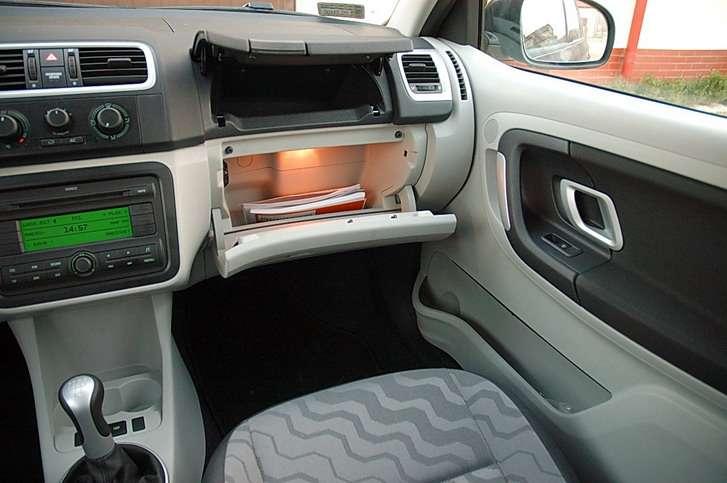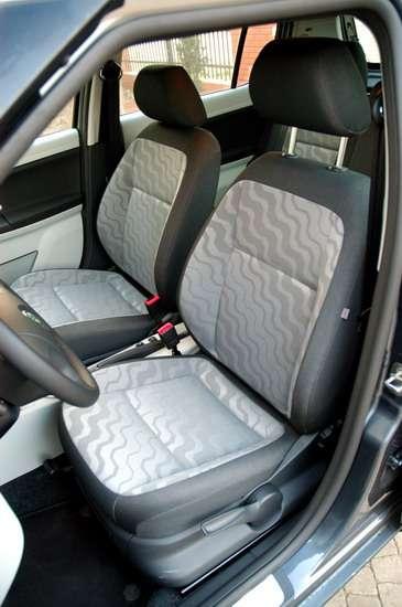 Co więcej, siedziska można jednym ruchem ręki wypiąć z zawiasu i po prostu je wyjąć. Przy normalnym położeniu siedzeń bagażnik Fabii pomieści 300 litrów bagażu – o 40 więcej, niż w poprzednim modelu, co jest jednym z najlepszych wyników w tej kategorii samochodów. Po złożeniu tylnych siedzeń przestrzeń rośnie do ponad 1160 litrów, ale przestrzeń podłogi nie jest idealnie płaska. Obniżono za to wyraźnie krawędź załadunku. Bagażnik wyposażono w kilka prostych, a przydatnych rozwiązań. Są tu dodatkowe kieszenie na bocznych ściankach, małe haczyki na torby a w narożach znalazły się nawet stalowe uszy do umocowania ładunku czy dodatkowej siatki. W bocznej ścianie można też zainstalować półokrągłą przegródkę do przewozu drobnych przedmiotów. Przydatnym patentem wydaje się też możliwość umocowania półki w połowie wysokości bagażnika, tworząc przestrzeń dla bezpieczniejszego przewożenia drobnych przedmiotów. Pod podłogą bagażnika kryje się koło zapasowe oraz zestaw podstawowych narzędzi, sprytnie ulokowany w przestrzeni felgi. Sporo dodatkowych, choć niezbyt pojemnych schowków udało się wygospodarować także w przestrzeni pasażerskiej – w tym podwójny schowek przed pasażerem, pomimo zamontowania poduszki dla pasażera. Wnętrze testowanego modelu miało dwukolorową tapicerkę oraz plastiki i choć były to w zasadzie dwa odcienie szarości, to jednak wnosiły wyraźne ożywienie do schludnego, ale nudnego wnętrza. Jakość materiałów i plastików w tej klasie nie odbiega od konkurencji, a może i ją przewyższa. Za kierownicą Fabii bez żadnych nieprzyjemnych niespodzianek – wszystko jest tam, gdzie być powinno – do czego zresztą przyzwyczaiła nas poprzednia Fabia i ogólnie cała rodzina samochodów grupy VW. Przednie fotele nie są szczytem luksusu i uformowano je dość płasko, ale nawet i przy dłuższych przebiegach nie powodują zmęczenia kierowcy. Z wyłączeniem ubogo wyposażonej wersji Junior, w każdej innej opcji mają one standardową regulację wysokości. Regulowana w dwóch płaszczyznach jest też kierownica, co pozwoli w zasadzie każdemu kierowcy na zajęcie wygodnej pozycji.