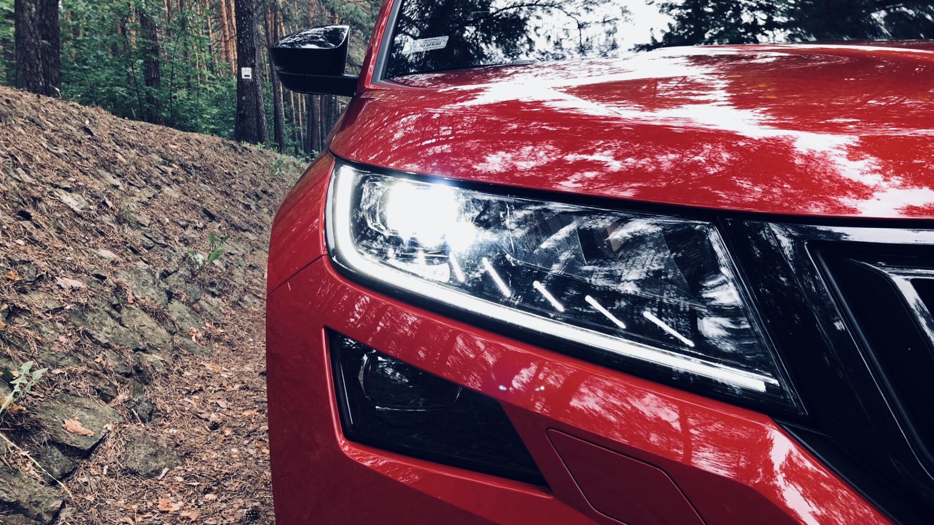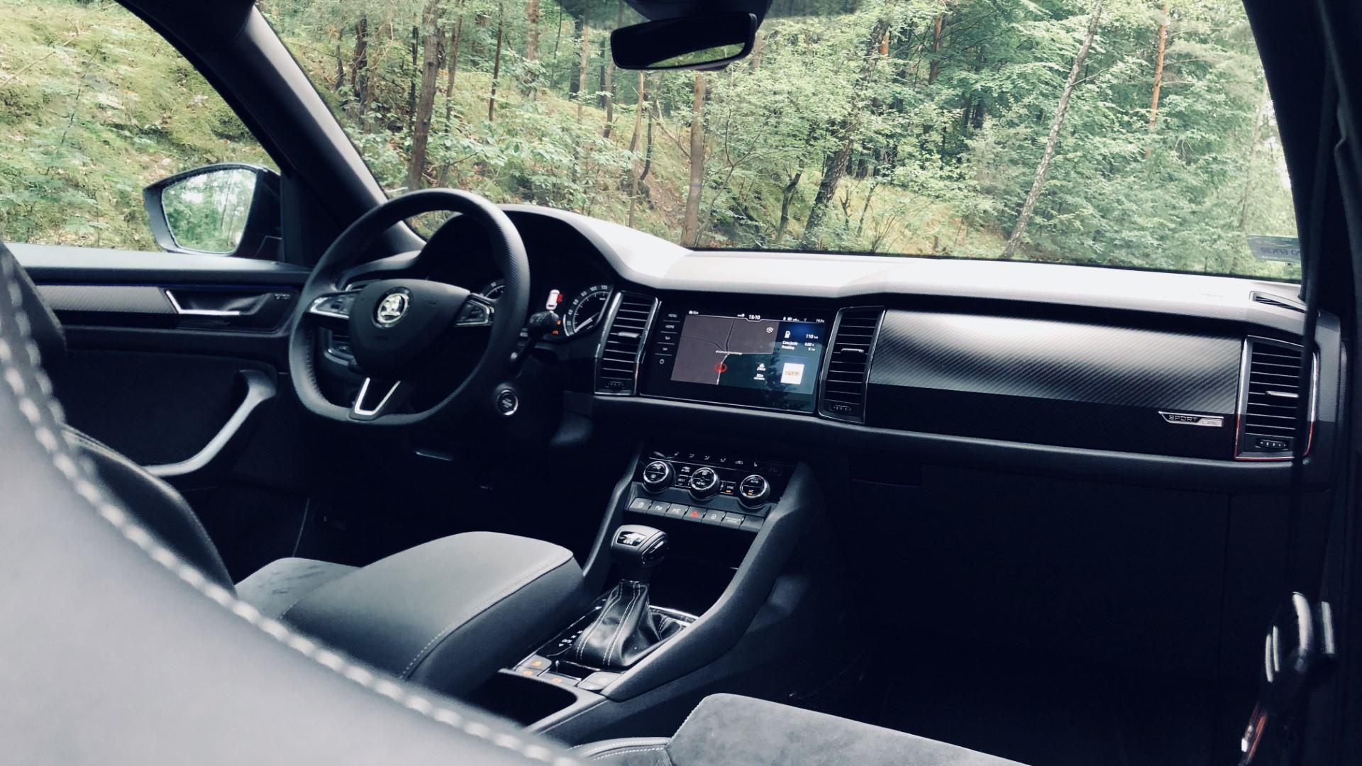 Zauważyliście, że całe wnętrze utrzymane jest w ciemnych kolorach, a jasnej tapicerki nie dostaniemy nawet za dopłatą? To nie przypadek. Czarna podsufitka czy deska rozdzielcza mniej rozprasza kierowcę. W wyścigach każdy szczegół się liczy. Kodiaqiem raczej nikt nie będzie brać udziału w rajdach, jednak miło, że projektanci zadbali nawet o takie detale.