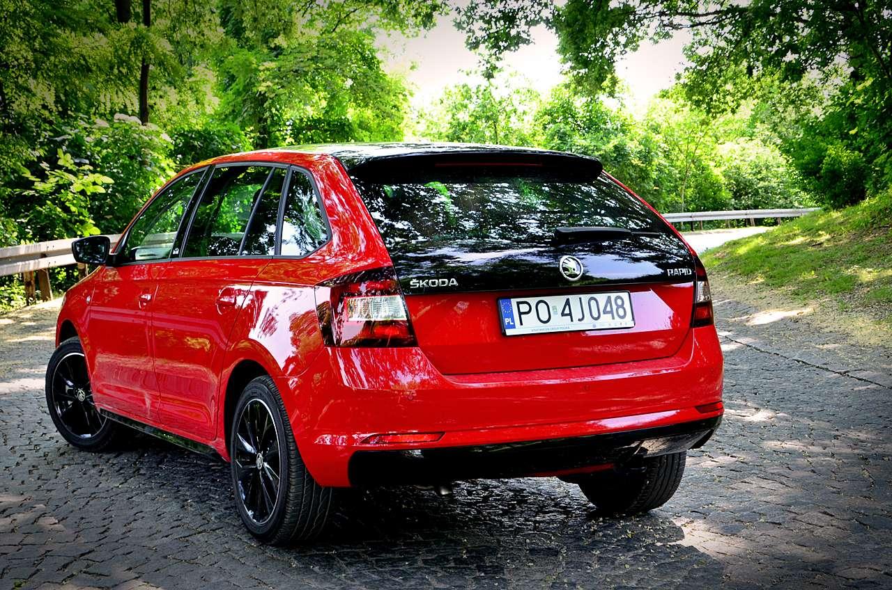 Przeglądając katalogi czy mijając Skody edycji Monte Carlo, będziemy najczęściej widywać połączenie czerwieni z czernią. Choć kontrastowy lakier wygląda fajnie, to wcale nie musimy się do niego ograniczać - w ofercie nadal pozostaje żółty, zielony, niebieski, kilka odcieni bieli, szarości i czerni. Czarne dodatki są jednak… obligatoryjne. Skoda Rapid Monte Carlo wyróżnia się więc czarną kratownicą, czarnymi lusterkami, czarnymi felgami, czarnymi akcentami na zderzakach i progach i ciemnym oknem panoramicznym. Na tylnym zderzaku spotkamy się z atrapą dyfuzora i właściwie na tym koniec zmian. W standardzie dostajemy 16-calowe felgi, a za dopłatą 950 zł fajniejsze 17-tki.