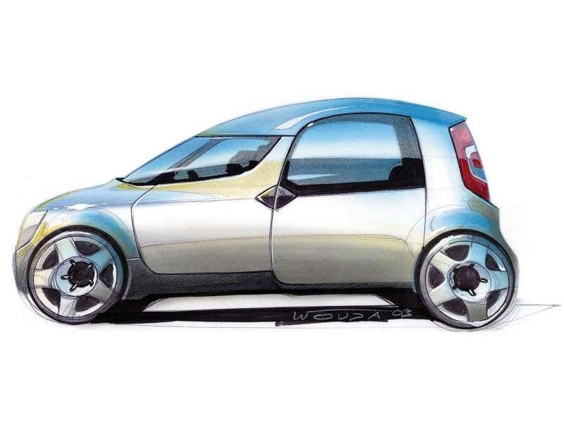 Szkic zmaterializował się w w 2003 roku jako auto koncepcyjne. Przesuwne tylne drzwi, ogromny rozstaw osi, odważnie ukształtowany dach, efektowne okno dachowe i dziwaczne szklane drzwi do bagażnika. Śmiałe rozwiązania nie odstraszyły jednak publiczności, której ten pierwszy krok Skody w segmencie minivanów bardzo się spodobał. Czesi zaczęli więc przygotowywać Roomstera do produkcji.