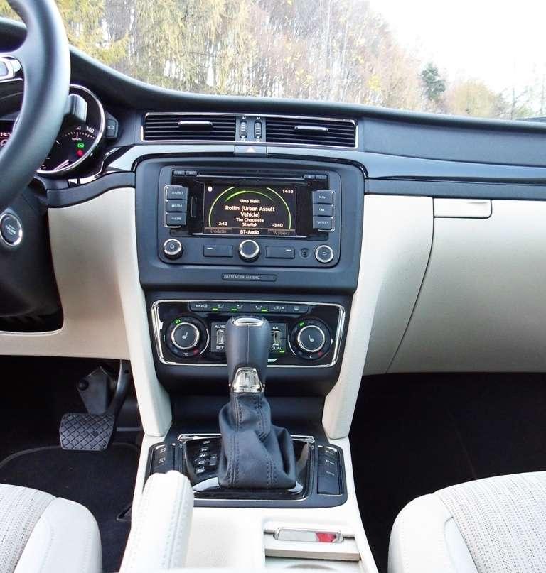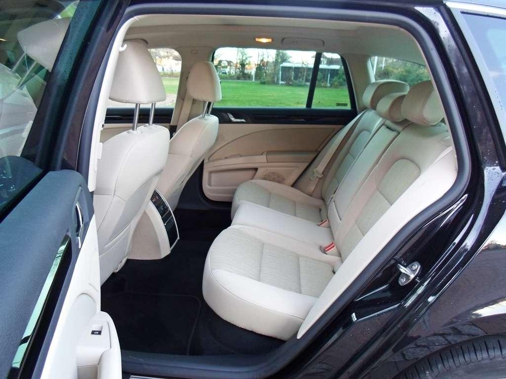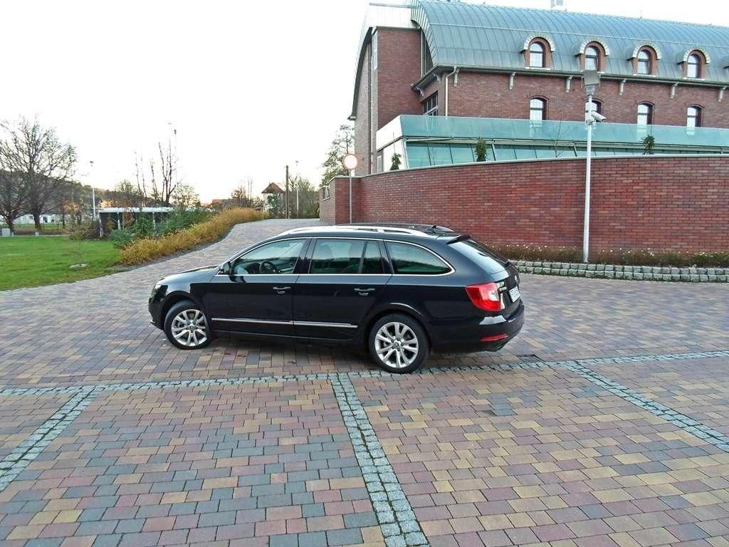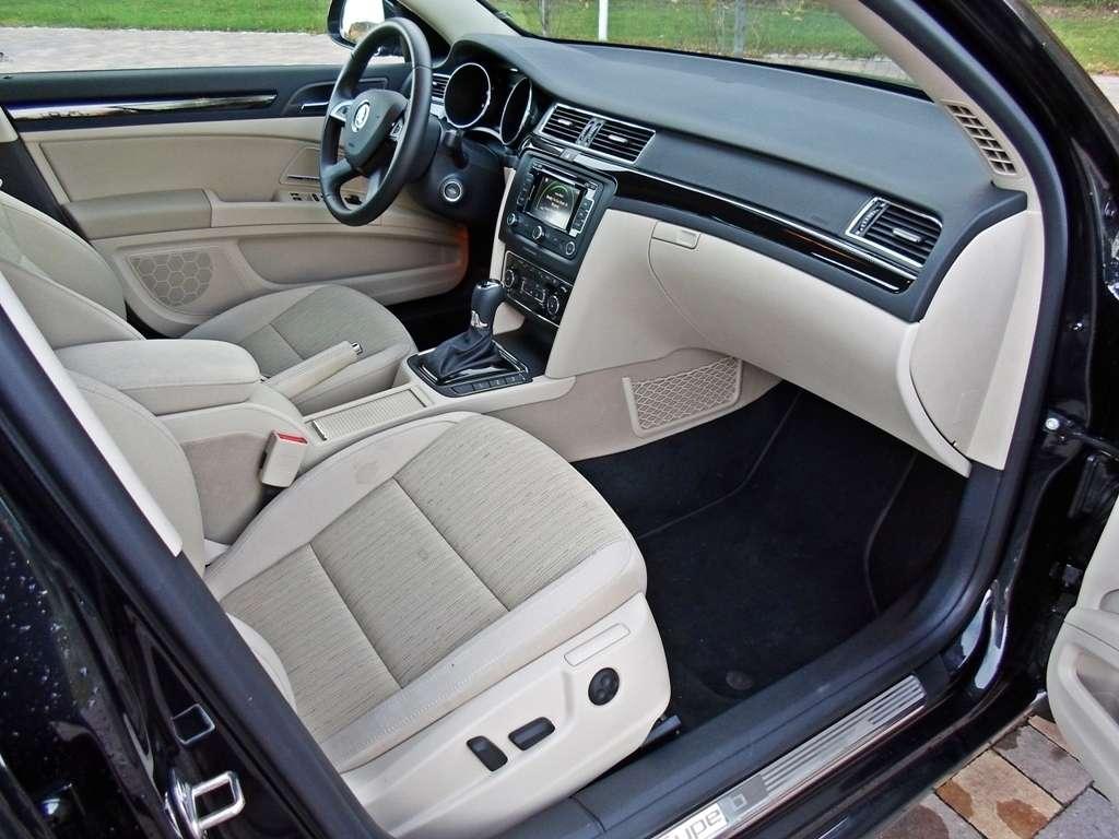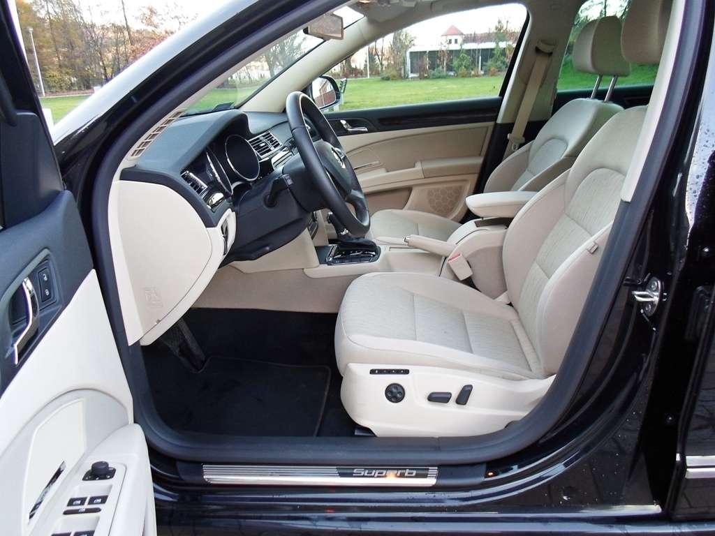 Patrząc z boku na karoserię uświadamiamy sobie jak wielką kabiną dysponuje ten model Skody. Właściwie mamy wrażenie, że do wielkiego przedziału pasażerskiego został doczepiony krótki przód, w którym zmieści się tylko przeciętnej wielkości silnik i nic więcej. Z tej perspektywy Superb wygląda najbardziej ociężale. Jednak nie mam zamiaru tego krytykować, bo zmierzam do czegoś innego. Tak wielka kabina obiecuje mnóstwo przestrzeni wewnątrz i kusi, by wreszcie pociągnąć za klamkę i sprawdzić jaka jest w rzeczywistości. Po zajęciu miejsca nie ma żadnych wątpliwości - miejsca jest pod dostatkiem w każdym kierunku, zarówno z przodu jak i z tyłu. Doprawdy niewiele jest samochodów na rynku dających większą swobodę ruchów. A jeśli kierowca jest niewysoki, pasażer tylnej kanapy z powodzeniem może założyć nogę na nogę i delektować się podróżą. Przestrzeń to jedna z największych zalet Superba. Potężny rozstaw osi pozwolił wygospodarować dużą ilość miejsca zwłaszcza na dolne kończyny. W testowanym egzemplarzu wrażenie ogromnej przestrzeni potęgowały jasna tapicerka i panoramiczny dach, które niezwykle skutecznie rozświetlały wnętrze. Dach warty jest dopłaty, ale jasna tapicerka już niekoniecznie. Jeśli często podróżujecie z większą ilością pasażerów, a zwłaszcza dziećmi, nie ma szans utrzymać jej w przyzwoitym stanie dłużej niż kilka tygodni. Jeżeli już koniecznie chcecie jasny wystrój wnętrza lepiej wysupłać dodatkową gotówkę z portfela i dopłacić do skórzanej tapicerki. Będzie nie tylko praktyczniej, ale i bardziej elegancko.