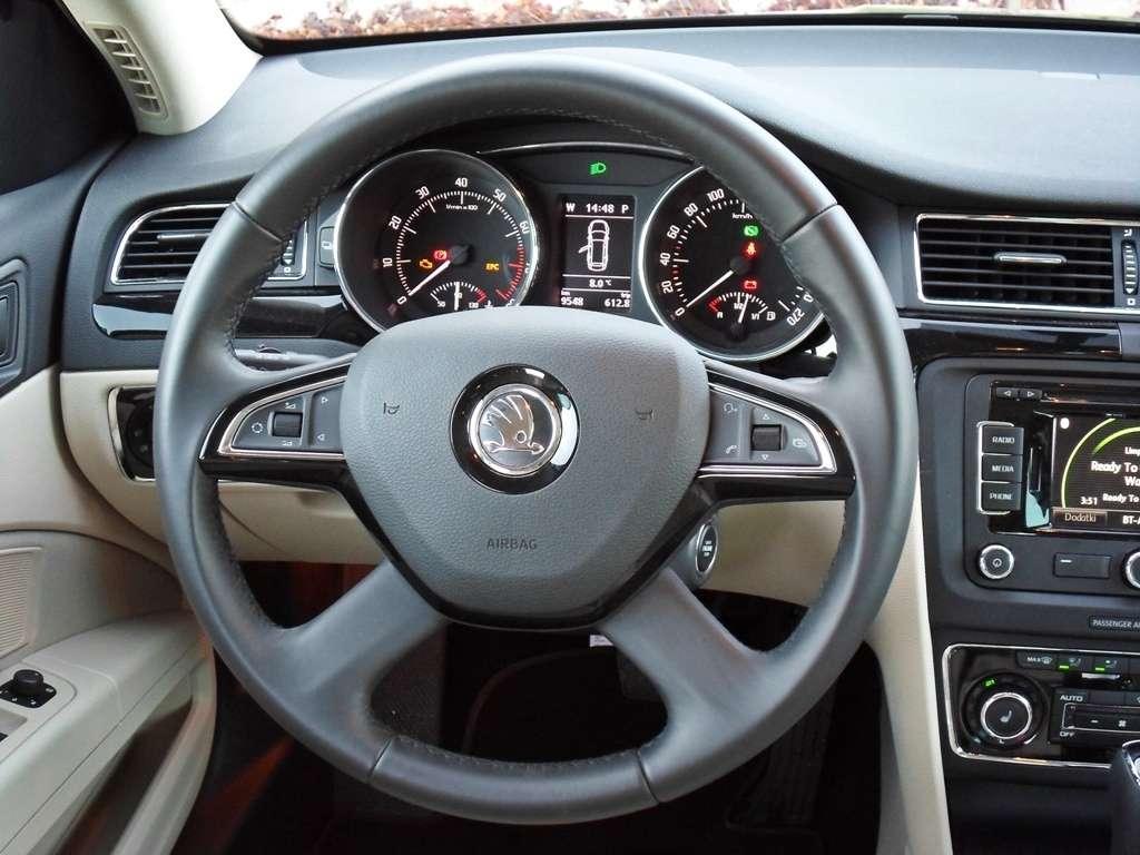 Ergonomia stoi na najwyższym poziomie i chyba trudno o prostszą obsługę systemów pokładowych. Ale w konsoli środkowej jest jeden element, który niezwykle rozczarowuje - zupełnie jak kolejna para skarpet znaleziona w pięknym opakowaniu pod choinką. Mam na myśli ekran nawigacji, który swoją wielkością dorównuje, a nawet ustępuję wielu dostępnym na rynku smartfonom. Mizerny wyświetlacz ginie na desce rozdzielczej oraz utrudnia korzystanie z niego zwłaszcza, że można go obsługiwać przez dotyk. Wiem, że samochód to nie konsola do gier, ale w dobie tanich jak przysłowiowy barszcz ekranów LCD naprawdę można, by było dorzucić kilka cali więcej. Zwróciłbym jeszcze uwagę na brak kamery cofania, co w przypadku dzisiejszych standardów i wydawać, by się mogło dobrze wyposażonej wersji nieco rozczarowuje. Na pocieszenie testowany egzemplarz został wyposażony w rozbudowany system czujników parkowania i system "Park Assist", który pomoże wcisnąć dużą Skodę w ciasne miejsce postojowe. Jeśli chodzi o "bajery" niezmiennie podoba mi się parasolka chowana w boczku drzwiowym. Mała rzecz, a cieszy - nie tylko w deszczowe dni.