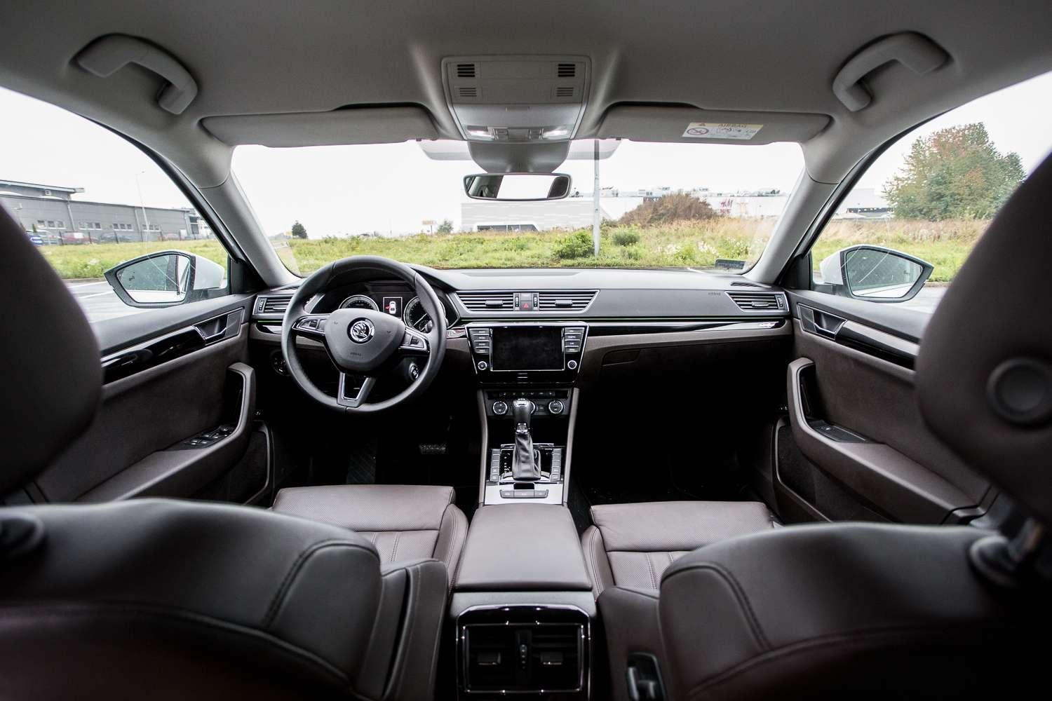 Luksusowy projekt zdecydowanie potęguje wrażenie przestrzeni towarzyszące każdemu, kto do nowego Superba wsiadł. Deska rozdzielcza jest zauważalnie szersza, niż w samochodach skromniejszego segmentu; przez prostą linię, na której została oparta, mamy wrażenie, że nie będziemy w stanie sięgnąć końca.