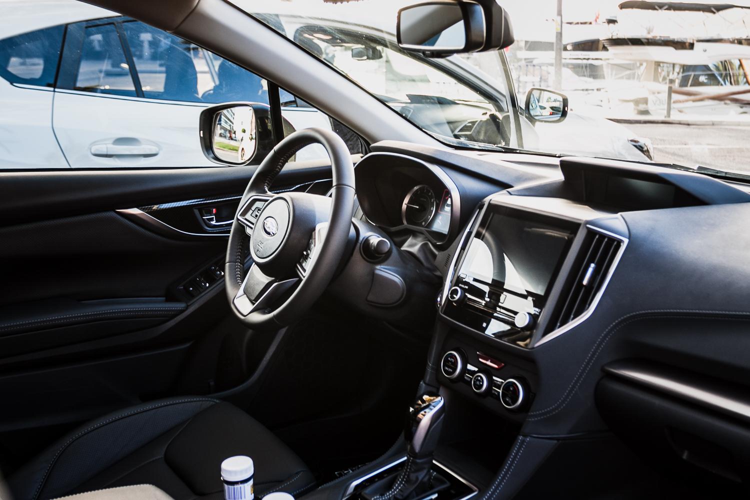 Pamiętacie wnętrza modeli Subaru sprzed kilku lat? Słaba jakość materiałów, kiepskie spasowanie, nieczytelna obsługa… To wszystko przeszłość! Po otwarciu drzwi można doznać pozytywnego szoku. Zdecydowana większość materiałów wykończeniowych we wnętrzu jest miękka w dotyku, co ciekawe: zarówno z przodu jak i z tyłu. Samochód wygląda niezwykle nowocześnie. Pierwsze dobre wrażenie zrobiła tapicerka drzwi − elementy z ekoskóry, miękkie tworzywa pod bocznymi szybami, lakierowane dekory wokół klamek o strukturze włókna węglowego, bardzo wysokiej jakości przyciski sterowania szyb i lusterek. Kierownica ma gruby wieniec, ale świetnie leży w dłoniach. Co więcej, w świetle wieńca bardzo dobrze widoczne są zegary, które co prawda są analogowe, ale posiadają centralny kolorowy wyświetlacz komputera pokładowego. Ta „nowoczesność” przestaje szokować na tle konkurentów: nie ma mowy o wyświetlaczu head-up czy wirtualnych zegarach. Mimo że podróżowaliśmy najbogatszą wersją wyposażenia, nie znaleźliśmy na liście wyposażenia opcji między innymi: wentylacji foteli, podgrzewania kierownicy czy funkcji auto hold hamulca postojowego, a przecież takie wyposażenie można znaleźć w wielu samochodach konkurencji.