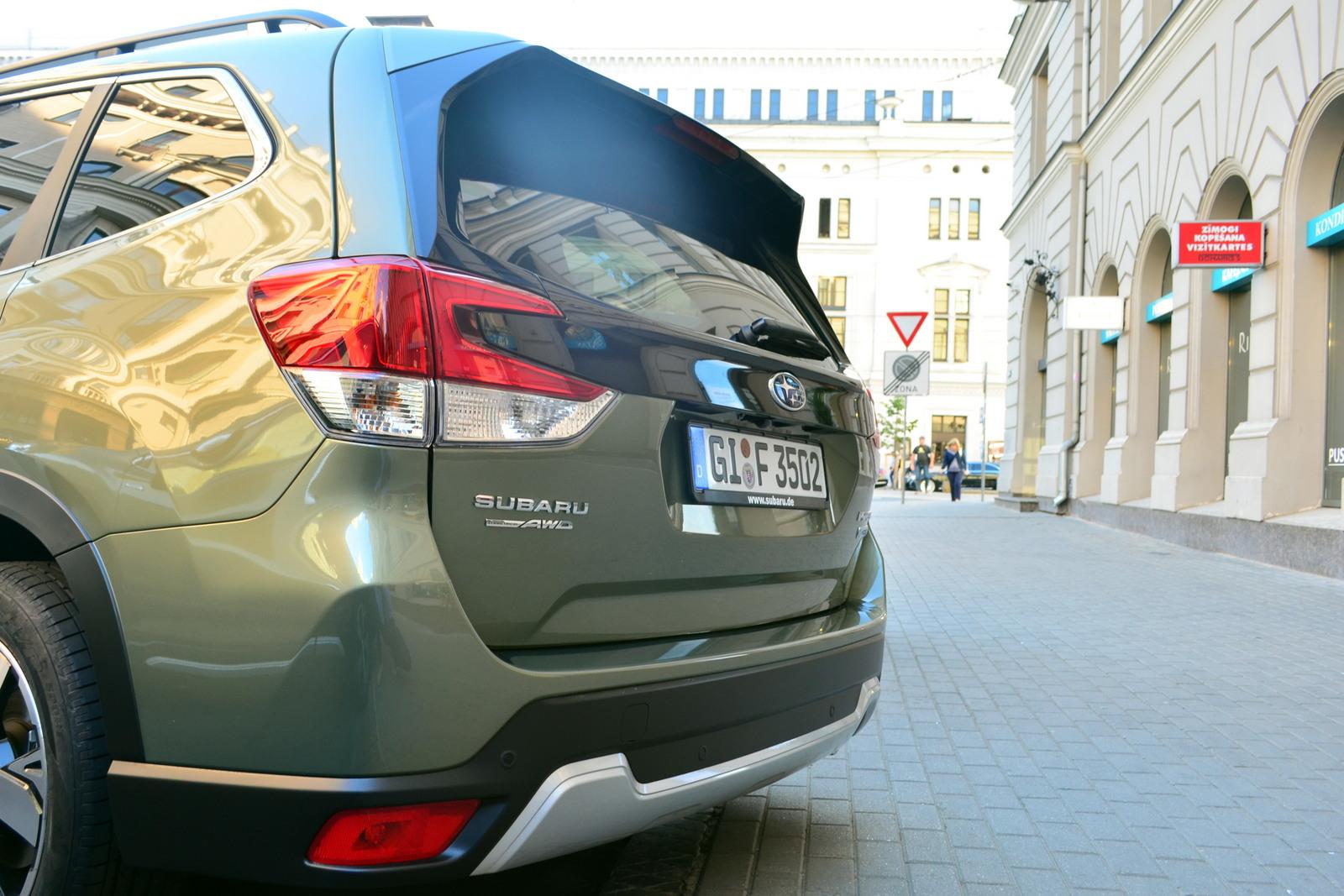 Pośród licznych elementów wyposażenia nowego dużego Subaru Forester szczególną uwagę poświęcono na usprawnienie działania mechanizmu elektrycznie otwieranej tylnej klapy. O ile faktycznie działa ona teraz wyraźnie szybciej, o tyle wysokość, na którą się unosi pozostała na „azjatyckim” poziomie i trzeba uważać, żeby sobie o nią nie nabić guza. Ciekawą opcją, przydatną zarówno w terenie, jak i w mieście jest kamera montowana w prawym zewnętrznym lusterku, skierowana na prawe przednie koło. Pomaga ona przy terenowych przeprawach i wjeżdżaniu na krawężniki. Mówiąc o parkowaniu, nie sposób nie wspomnieć o innowacyjnym systemie czyszczenia kampery cofania. Otrzymała ona swój własny spryskiwacz, dzięki czemu nawet w złych warunkach atmosferycznych łatwo jest uzyskać z niej wyraźny obraz.