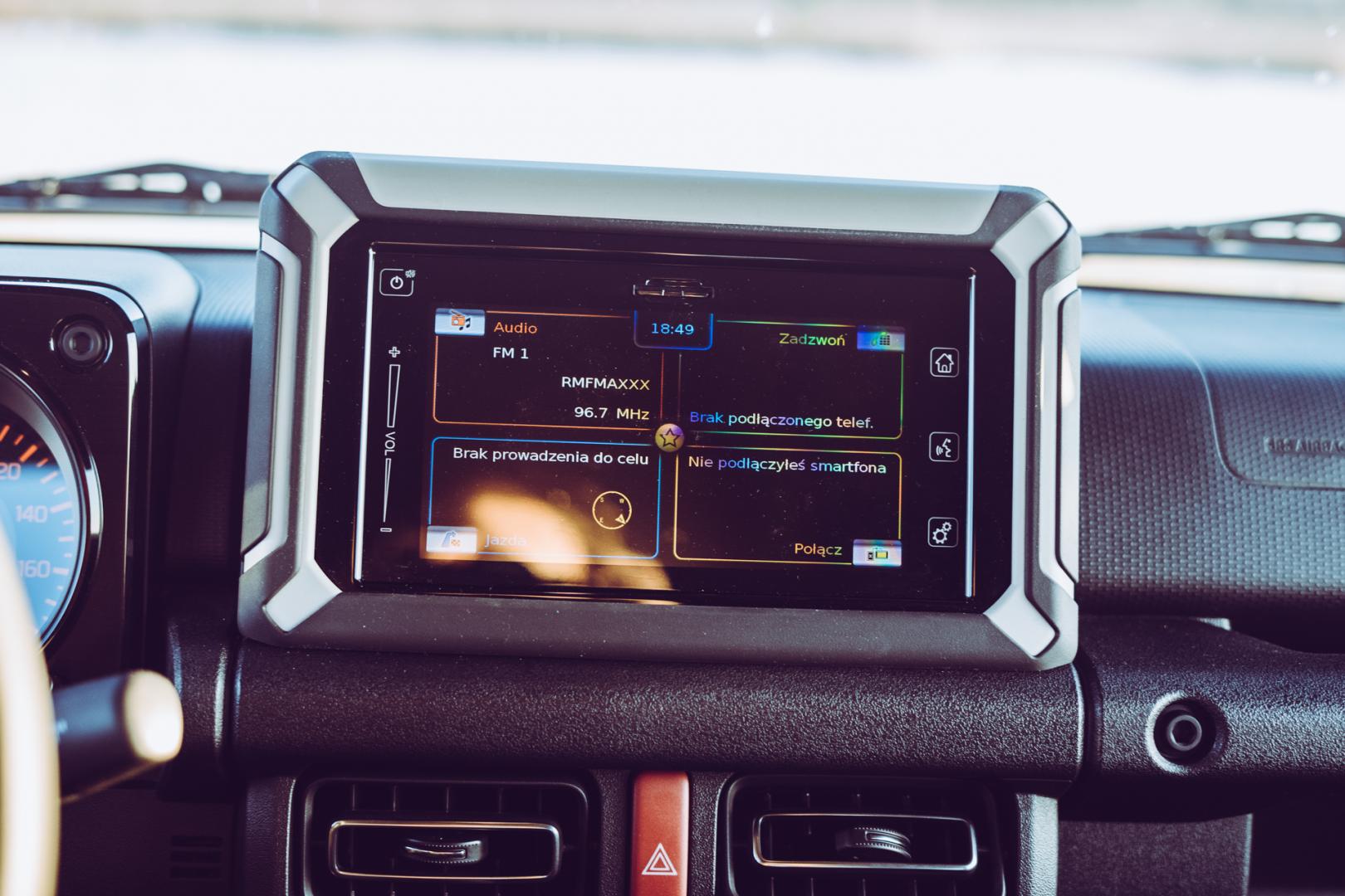 Ale to nie jest taki całkiem, w 100% surowy samochód. Nowe Suzuki Jimny ma przecież jednostrefową klimatyzację, ma system multimedialny z 7-calowym ekranem dotykowym, Apple Car Play, Android Auto i nawigacją – jakieś udogodnienia są.