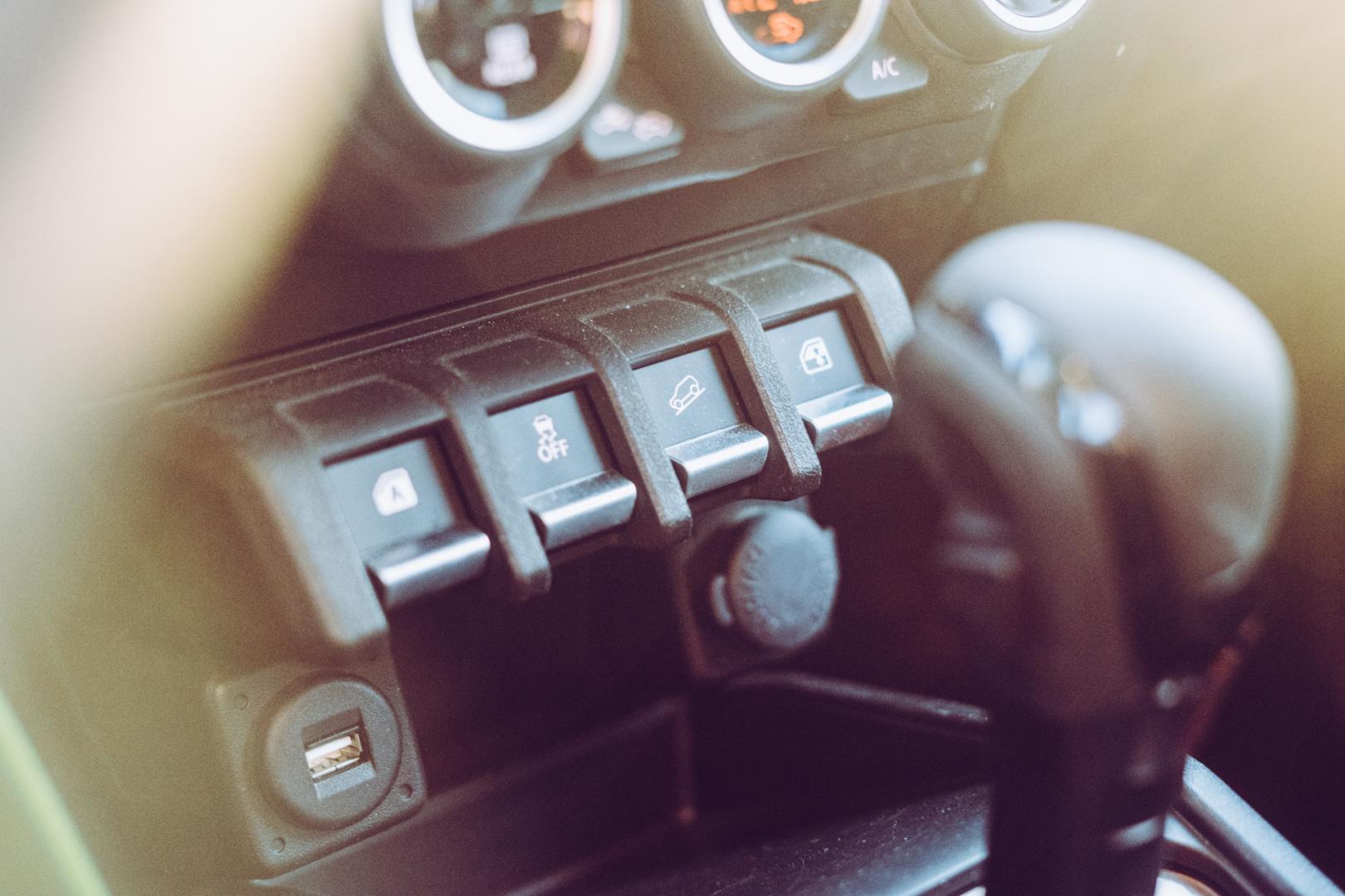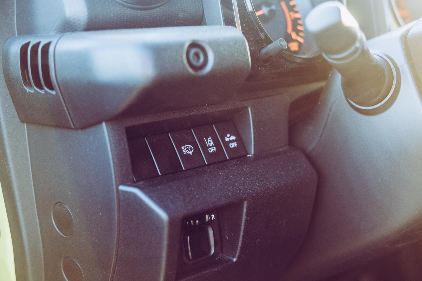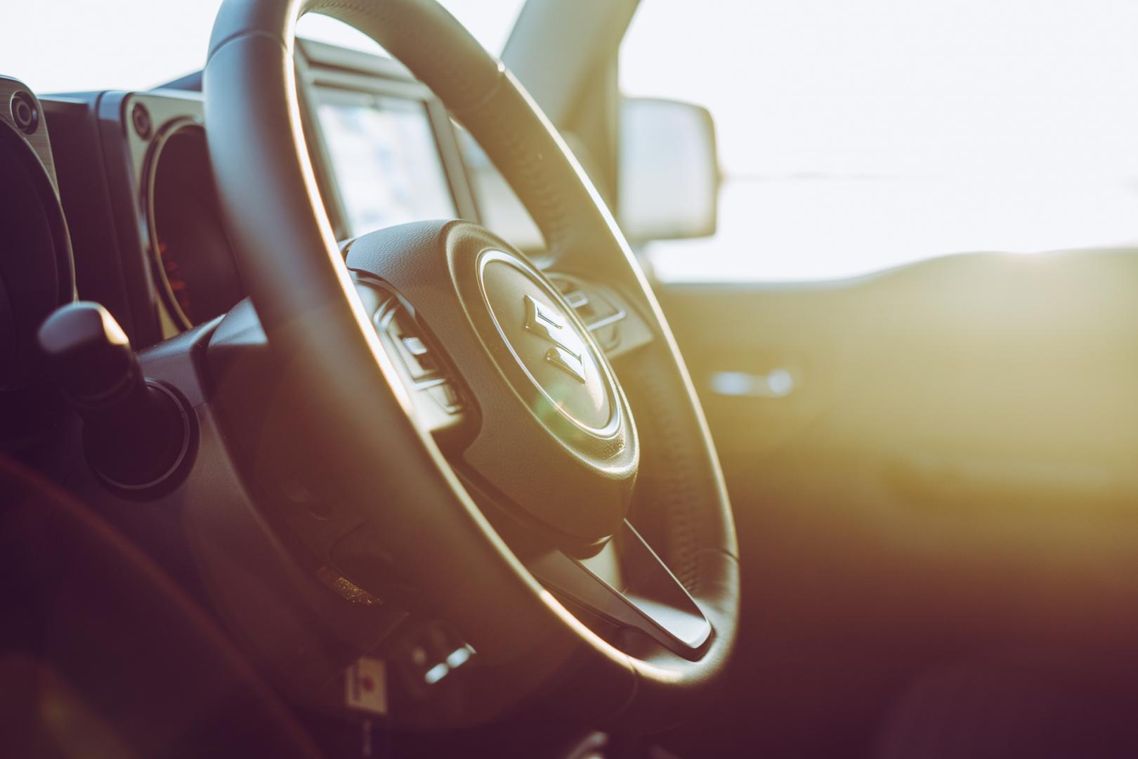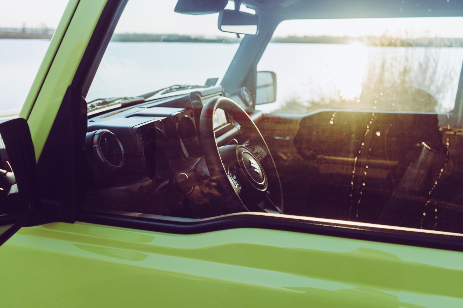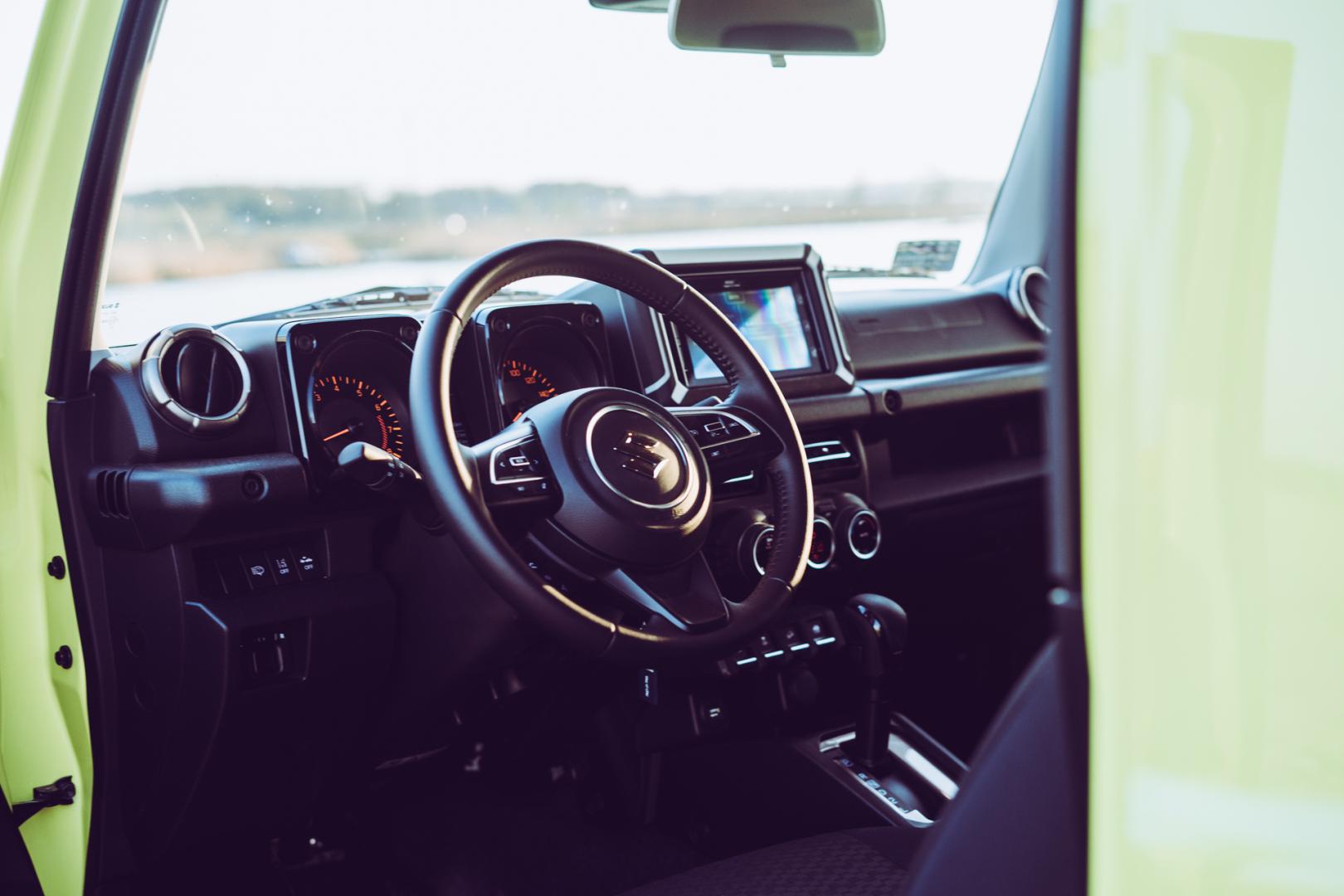 Wnętrze Jimny’ego również zdradza jego terenowy charakter. Prawie pionowa przednia szyba, razem z matowym wykończeniem górnej części deski rozdzielczej ma ograniczać odblaski.