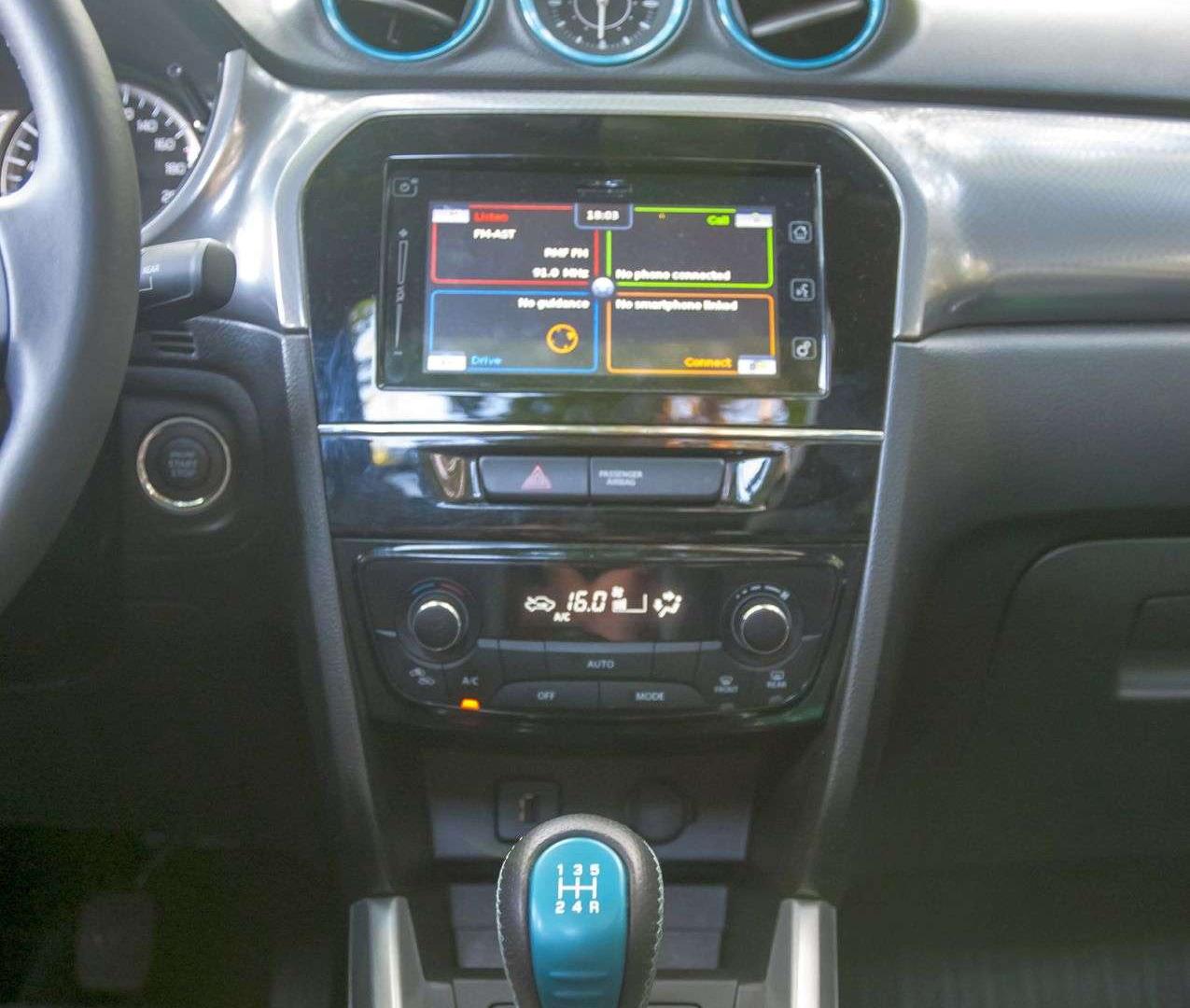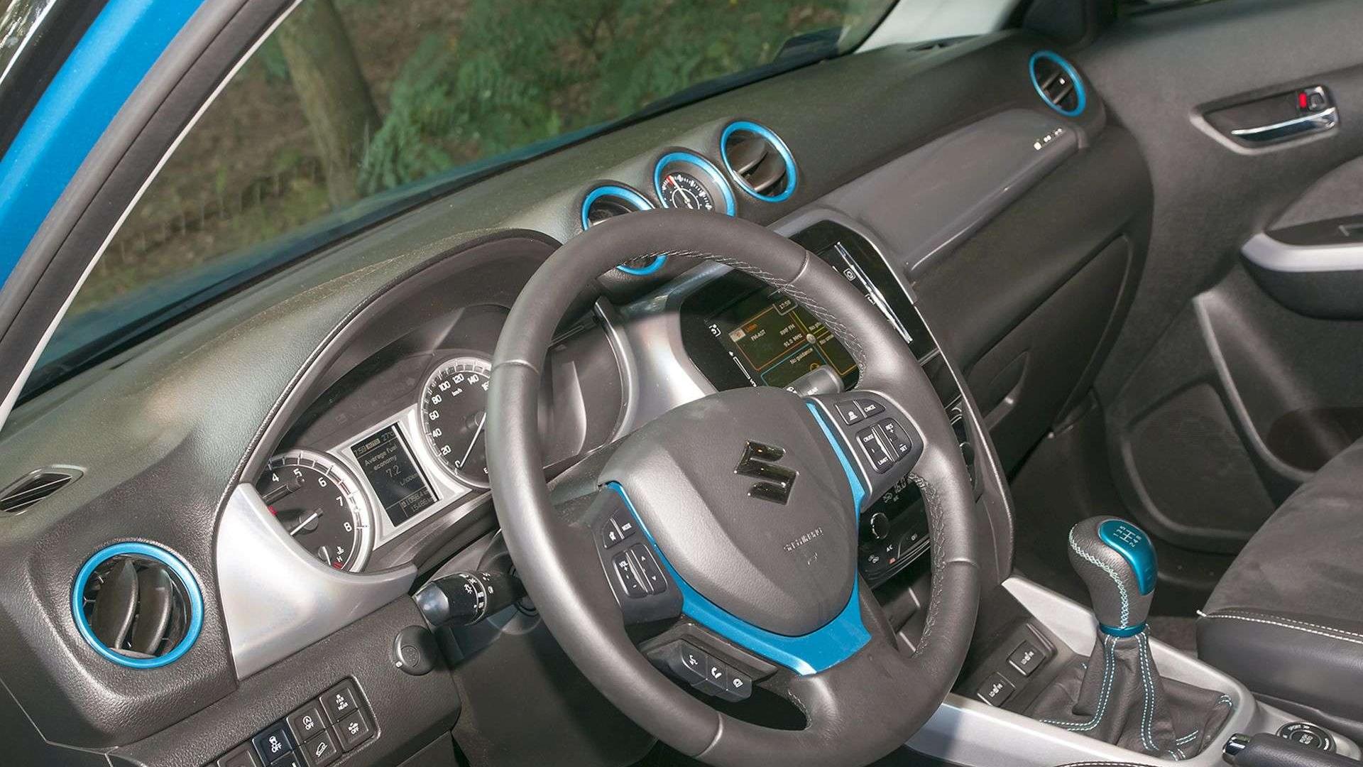 Czy turkus w Suzuki rzeczywiście jest turkusowy, tego nie wiem. Za to jestem przekonany, że z powodzeniem ożywia dość przeciętne wnętrze. Deska rozdzielcza z okrągłymi nawiewami nie ma w sobie nic szczególnego, do tego wykonano ją z twardego i niezbyt imponującego wyglądem plastiku. Patrząc na zegary, czy panel klimatyzacji, łatwo już rozpoznać markę, te elementy są charakterystyczne dla modeli Suzuki. Za to gwiazdą jest tu nowy system multimedialny z 7-calowym ekranem dotykowym. Oferuje dostęp do radia, multimediów, telefonu i nawigacji, a jego czułość i szybkość reakcji nie odstaje technologicznie od ekranów smartfonów. Z lewej strony ekranu umieszczono suwak głośności, ale czasem, zwłaszcza na nierównej nawierzchni trudno w niego trafić. Z pomocą przychodzi wielofunkcyjna kierownica z klasycznymi przyciskami do sterowania radiem.