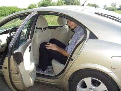 Miejsca na nogi na tylnej kanapie jest niezbyt wiele, głowa prawie dotyka podsufitki, wszystko zależy od wzrostu kierowcy: na zdjęciu pokazaliśmy ekstremalną sytuację - zarówno kierowca jak i pasażer za nim mają 2 metry wzrostu.