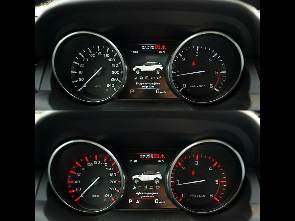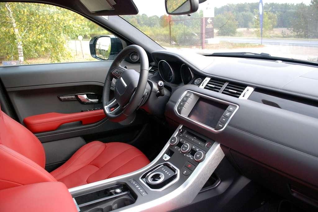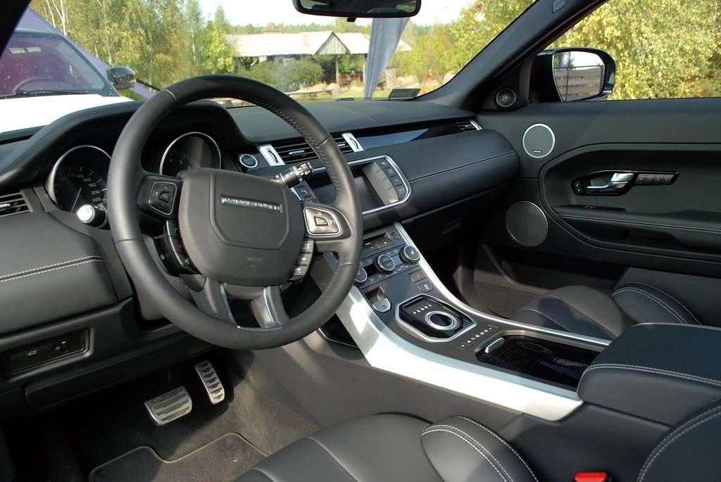 Środek auta nie jest już tak odważny stylistycznie, a szkoda bo tak świetne nadwozie mogło być zapowiedzią niezwykłego wnętrza. Klasyka z małymi designerskimi smaczkami – to mi przyszło na myśl, kiedy zasiadłem za kierownicą Evoque. Nie ma tu miejsca na tanie plastiki czy niedbałe spasowanie elementów. Jedynie tanio wyglądające zegary, żywcem wyjęte z Outlandera nie pasują mi do całości – wyglądają tak jakby ktoś przy projektowaniu o nich zapomniał i potem pożyczył je od Mitsubishi. Świetne kubełkowe fotele to połączenie komfortu i doskonałego bocznego trzymania. Do wykończenia każdego wnętrza użyto ponad 10m2 skóry Windsor – pięknej, wysokiej jakości skóry, wyprawianej ręcznie – z podwójnymi szwami. Środek deski rozdzielczej zajmuje ośmiocalowy ekran dotykowy stanowiący podstawowy element sterujący i wyświetlający parametry systemu audio, video, nawigacji i telefonu. Ciekawostką jest zastosowanie w wybranych modelach technologii Dual View, która pozwala na wyświetlanie różnych obrazów dla pasażera i kierowcy, dzięki czemu na tym samym ekranie pasażer może np. oglądać film DVD, a kierowca śledzić mapy nawigacyjne.