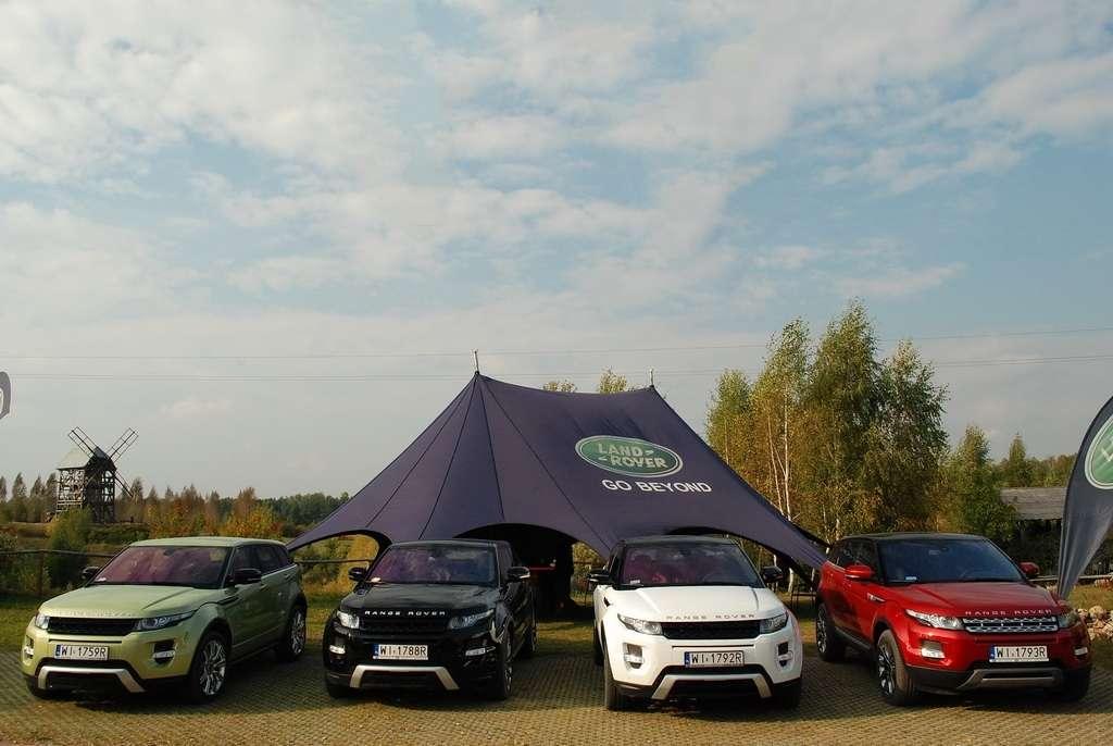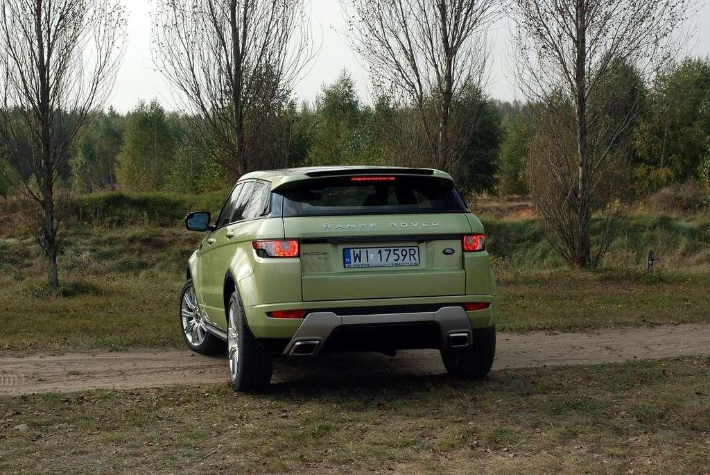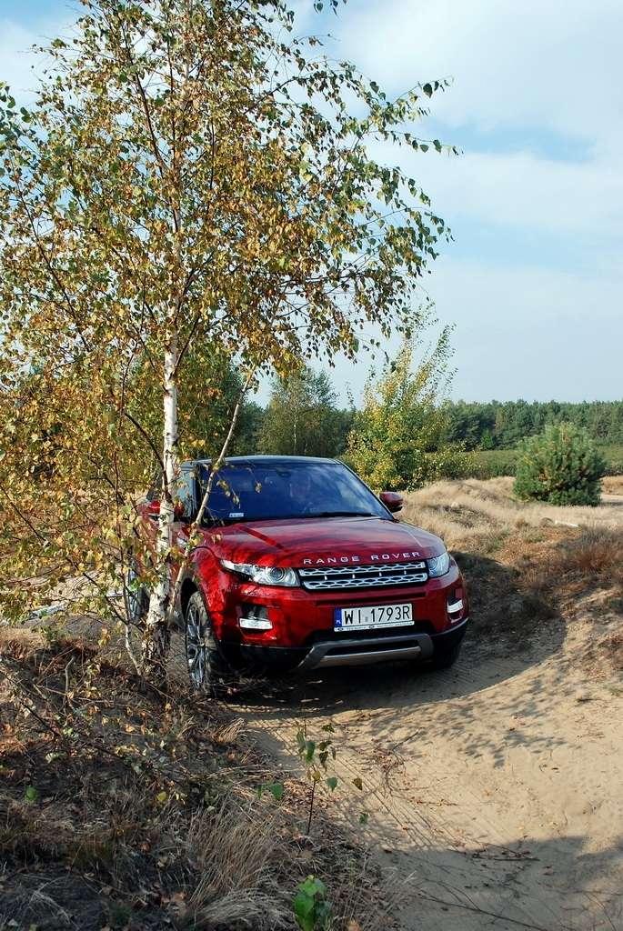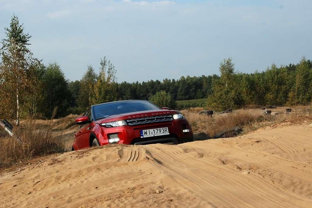 Kolejne jazdy mieliśmy okazję przeprowadzić w lekkim terenie. Chyba tylko ze względu na swój rodowód, Evoque jest reklamowany jako auto, które jest w stanie poradzić sobie w każdym terenie. Owszem, napęd na cztery koła, sprzęgło Haldex, krótkie zwisy czy też niezły prześwit przydały się przy pokonywaniu małych, piaskowych górek, lecz wątpię aby docelowa klientela miała zamiar na dwudziestocalowych kołach pchać się w teren trudniejszy niż kałuża pod domem czy parking pod stokiem narciarskim.