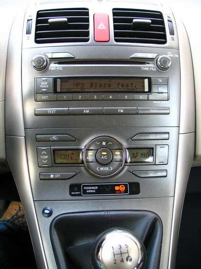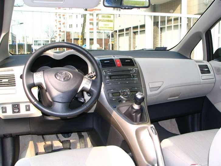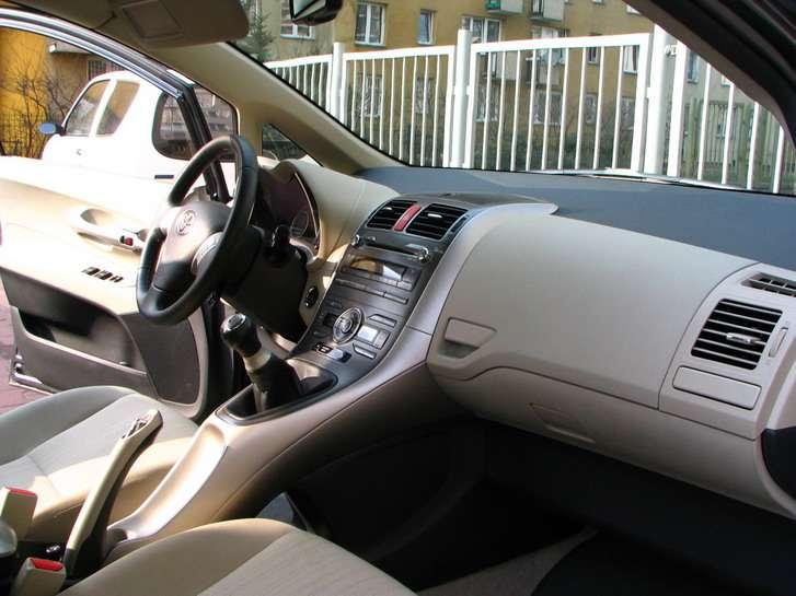 Wnętrze Aurisa jest wyraźnie większe od wnętrza Corolli hatchback. Kolorystyka materiałów cieszy oko, a innowacyjny kształt deski rozdzielczej przypadł do gustu wielu osobom. Jednak na każdym kroku czuć rękę księgowych, którzy wyraźnie poskąpili funduszy na lepszej jakości materiały wykończeniowe. Twardy plastik jest tu wszechobecny. Pasażer oddzielony jest od kierowcy wysoką konsolą, w której umiejscowiony jest drążek zmiany biegów. W dolnej części konsoli znaleźć możemy mały schowek – niestety nie znalazłem dla niego zastosowania – po pierwsze jest ciężko dostępny, po drugie strach mnie obleciał na myśl, że coś z rzeczy tam umieszczonych mogłoby znaleźć się pod pedałem hamulca .