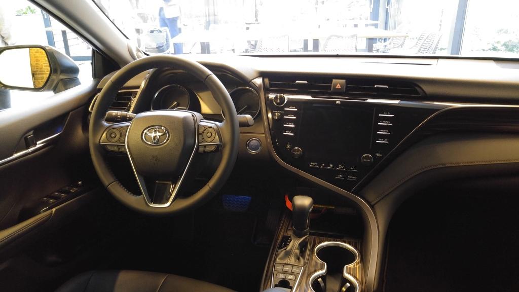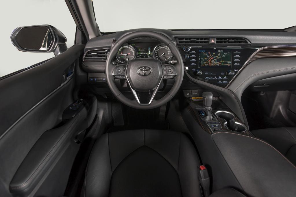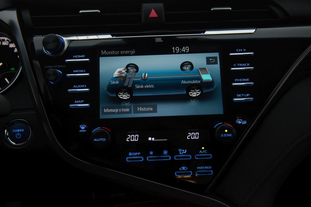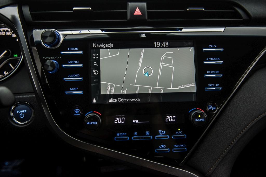 Z przodu nie jest wcale gorzej, Camry nie jest bowiem salonką nastawioną wyłącznie na wożenie VIP-ów. Deska rozdzielcza oferuje ekran dotykowy Toyota Touch 2 o przekątnej 7 lub 8 cali, wyświetlacz TFT (7-calowy) na tablicy wskaźników czy wyświetlacz przezierny HUD rzucający informacje bezpośrednio na przednią szybę. W Camry debiutuje nowy system nawigacyjny, nie zabraknie też nowinek jak choćby bezprzewodowej ładowarki smartfonów, czy luksusowych gadżetów w postaci jonizatora powietrza. Na melomanów czeka zestaw nagłośnieniowy firmy JBL.