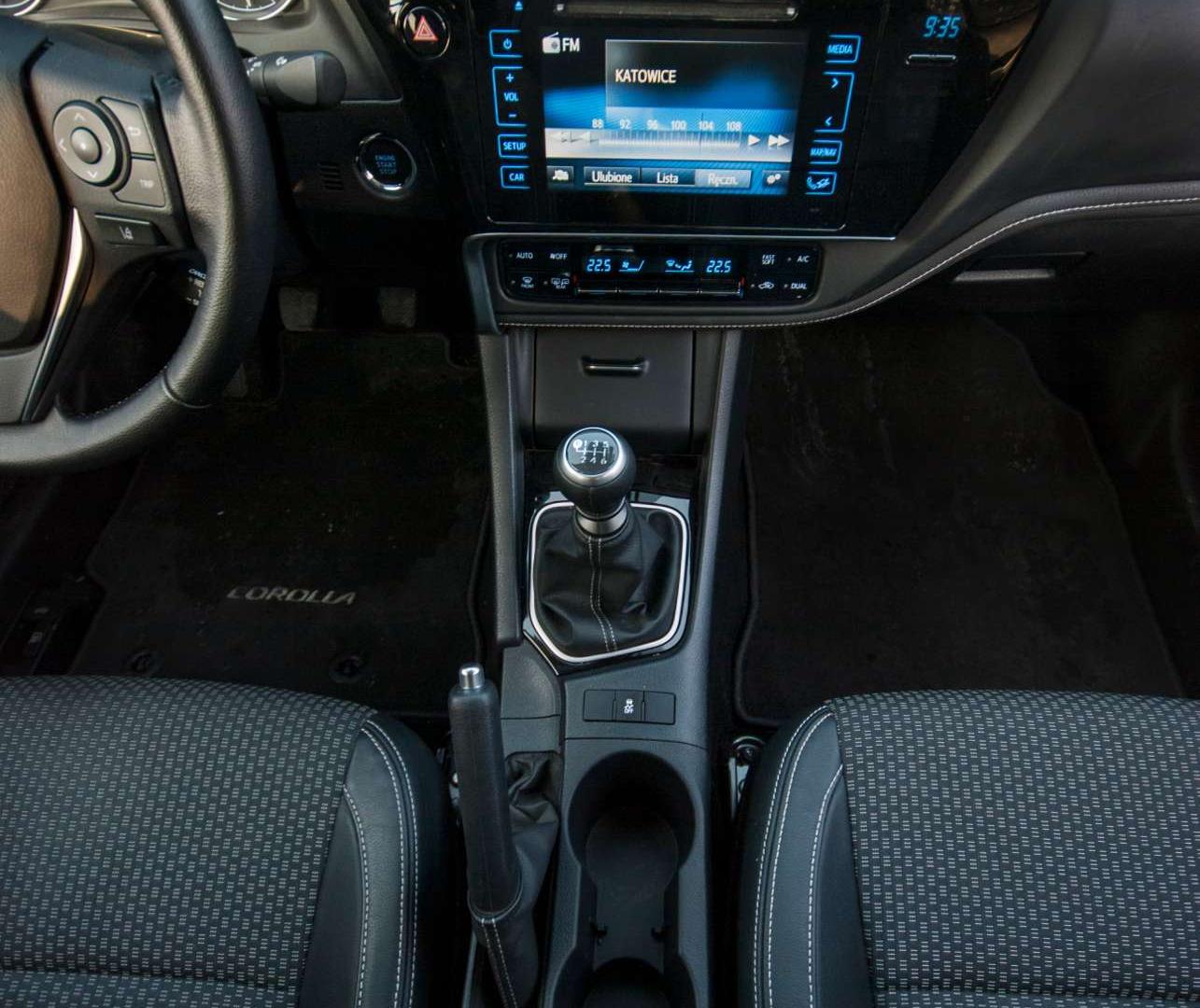 Poprawnie jest też za kierownicą - kokpit to wiernie odwzorowane rozwiązanie znane z Aurisa. Jak najbardziej na plus. W nowej Corolli ciężko doszukać się niepraktycznych rozwiązań, niesprawdzonych zabiegów stylistycznych czy złej jakości materiałów. Centralną część deski rozdzielczej zajmuje dotykowy ekran o przekątnej 7 cali, który znajdziemy w wielu innych autach w ofercie Toyoty. Zastrzeżenia wciąż te same – brak fizycznych przycisków sprawi, że każdy kierowca będzie potrzebował kilku dni, żeby "ogarnąć" obsługę systemu, bez odrywania wzroku od drogi. Za to kiedy już opanujemy ekran (na przykład wspomagając się sterowaniem z kierownicy), sam interfejs mile nas zaskoczy. Jego obsługa w czasie jazdy nie należy do najłatwiejszych, ale potrafi się odwdzięczyć podczas długich podróży wysoką funkcjonalnością i przejrzystością wyświetlanych informacji. Na szczególną pochwałę zasługuje opcjonalna nawigacja Toyota Touch 2 with Go. Panelem klimatyzacji sterujemy już za pomocą prostego systemu z fizycznymi przyciskami. Uwagę zwraca też wygodny podłokietnik, który doskonale współgra z dość wysoką dźwignią zmiany biegów.