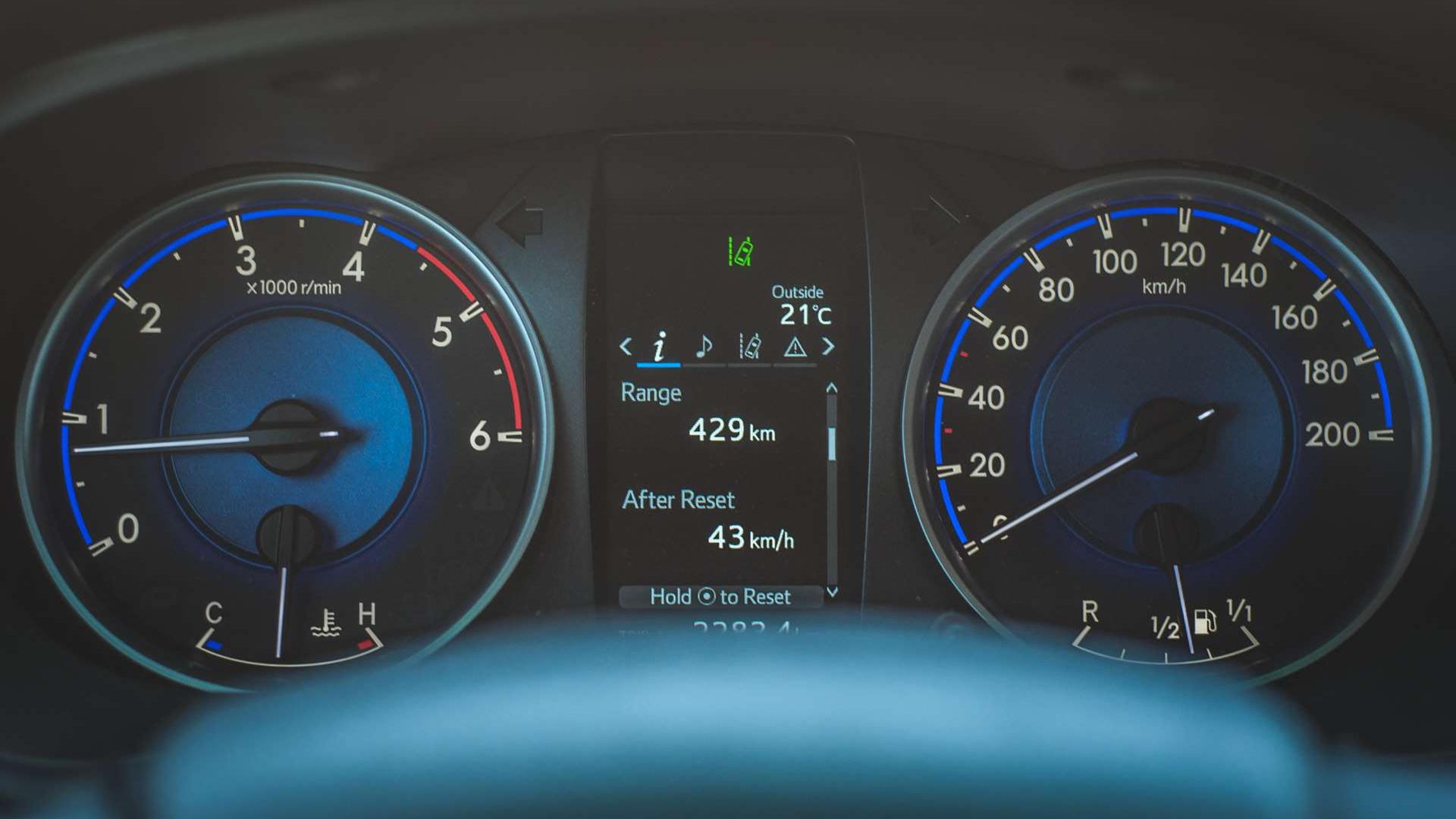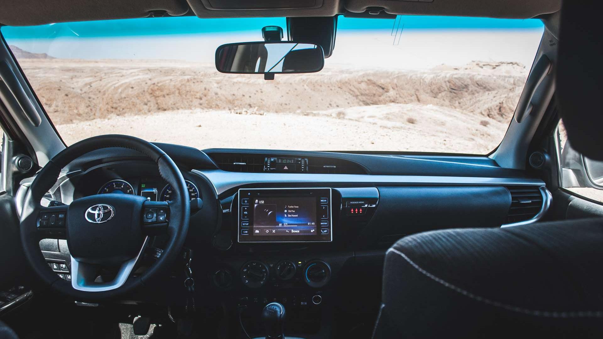 Jako że jest to samochód nowoczesny, na pokładzie czeka na nas 7-calowy tablet z nawigacją, radiem DAB i tym podobnymi gadżetami, mamy też zespół systemów Toyota Safety Sense, jak chociażby system ostrzegania przed kolizją z samochodem z przodu. System ten długo się temu opierał, ale w końcu poddał się działaniu tumanów kurzu sprezentowanych przez samochody jadące w konwoju przede mną. Pojawił się komunikat, by przeczyścić przednią szybę, ale kamera odpowiadająca za rozpoznawanie odległości pomiędzy samochodami i kontrolowanie pasa ruchu znajduje się poza zasięgiem wycieraczek i spryskiwacza.