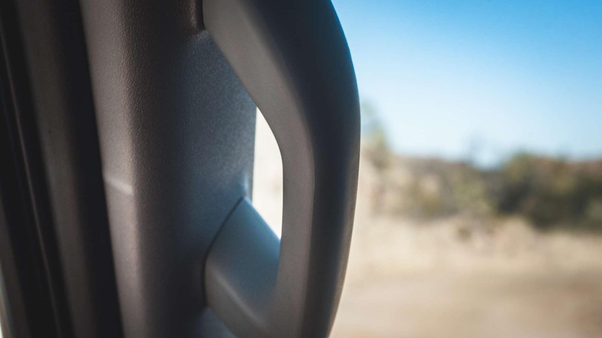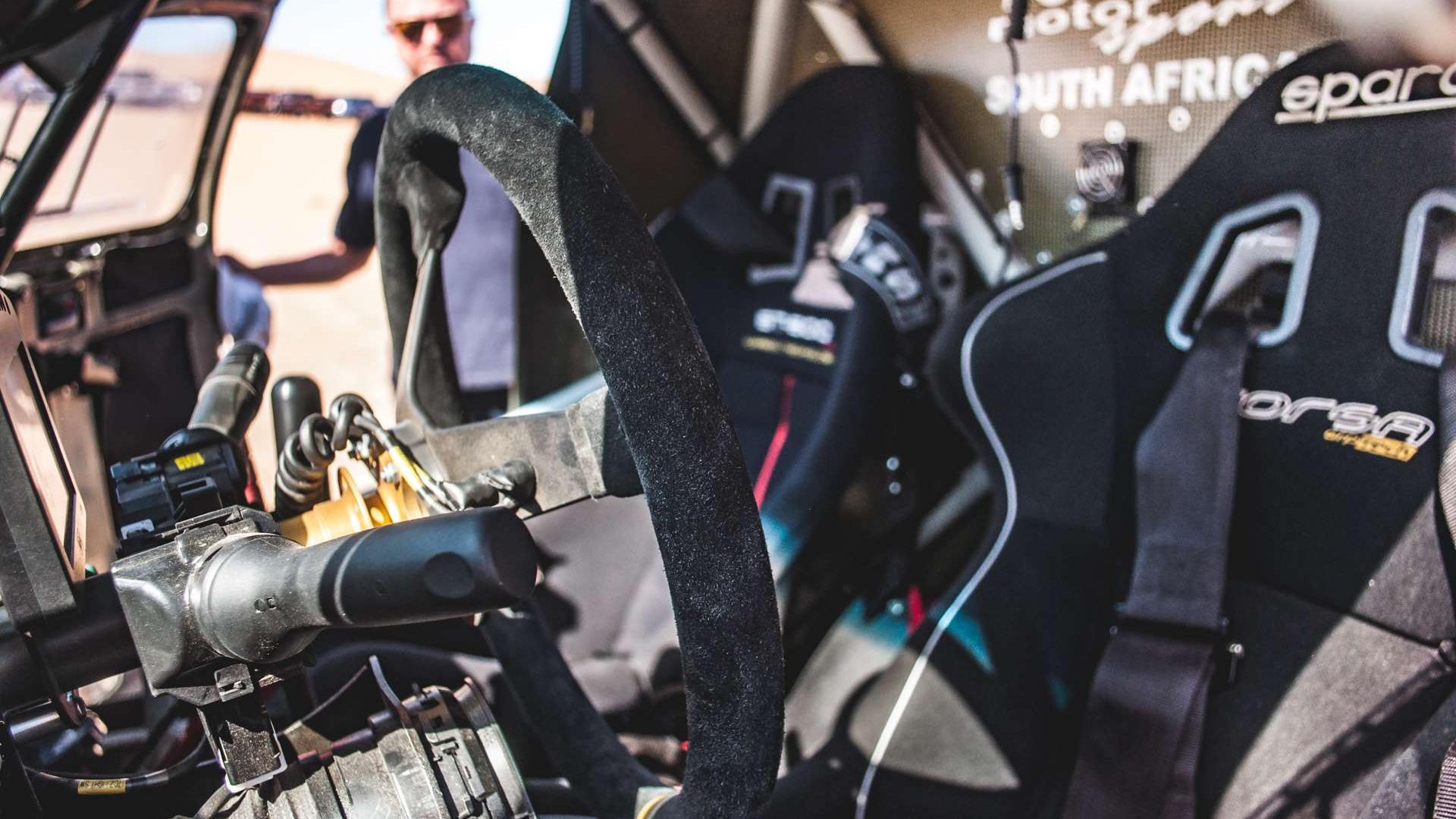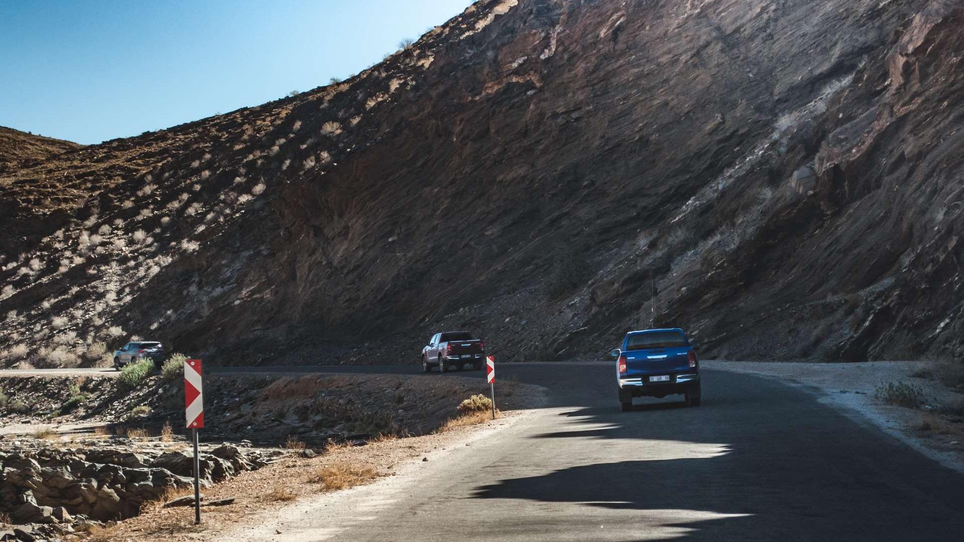 Cały czas nie możemy zapomnieć, że jesteśmy w Afryce - gdzieniegdzie zauważamy Oryksy, największe antylopy, jakie zobaczymy w Namibii. Wrażenie robi też stado pawianów, które przebiegło przez drogę nieopodal lotniska. Szybko zjeżdżamy z asfaltu na drogę szutrową. Jedziemy w dwóch konwojach, spod kół wzniecają się tumany kurzu. Widok jak z filmu akcji. Nawierzchnia jest bardzo kamienista, więc utrzymujemy odpowiednie odległości pomiędzy samochodami, żeby nie skończyć bez przedniej szyby. Przez cały czas poruszamy się z napędem tylnej osi - przedni dołączamy za pomocą odpowiedniego pokrętła, ale nie ma jeszcze sensu obciążać napędu. Nasza kolumna samochodów przez cały czas porusza się z prędkością bliską 100-120 km/h. Co zaskakuje, to komfort jazdy w takich warunkach. Zawieszenie dobrze wybiera nierówności, a jego praca nie przypomina też dryfującej na falach łódki. To zasługa przeprojektowanego resora, który wydłużono o 10 cm, przesunięto jego punkt mocowania o 10 cm do przodu i obniżono o 2,5 cm. Przedni stabilizator poprzeczny jest teraz grubszy, tylne amortyzatory przesunięte są do przodu, a to wszystko dla poprawy stabilności jazdy. Komfort pochodzi jednak z amortyzatorów o większych cylindrach, które lepiej tłumią małe drgania. Niespodziewanie przyzwoite jest też wyciszenie kabiny. Dobrze sprawdza się izolacja od hałasu aerodynamicznego, jak i tego pochodzącego z układu napędowego - w tym celu dodano też tłumik drgań skrętnych.