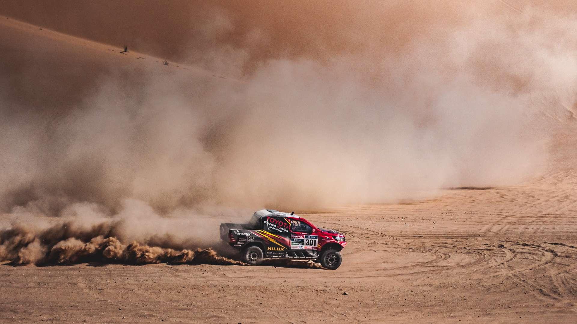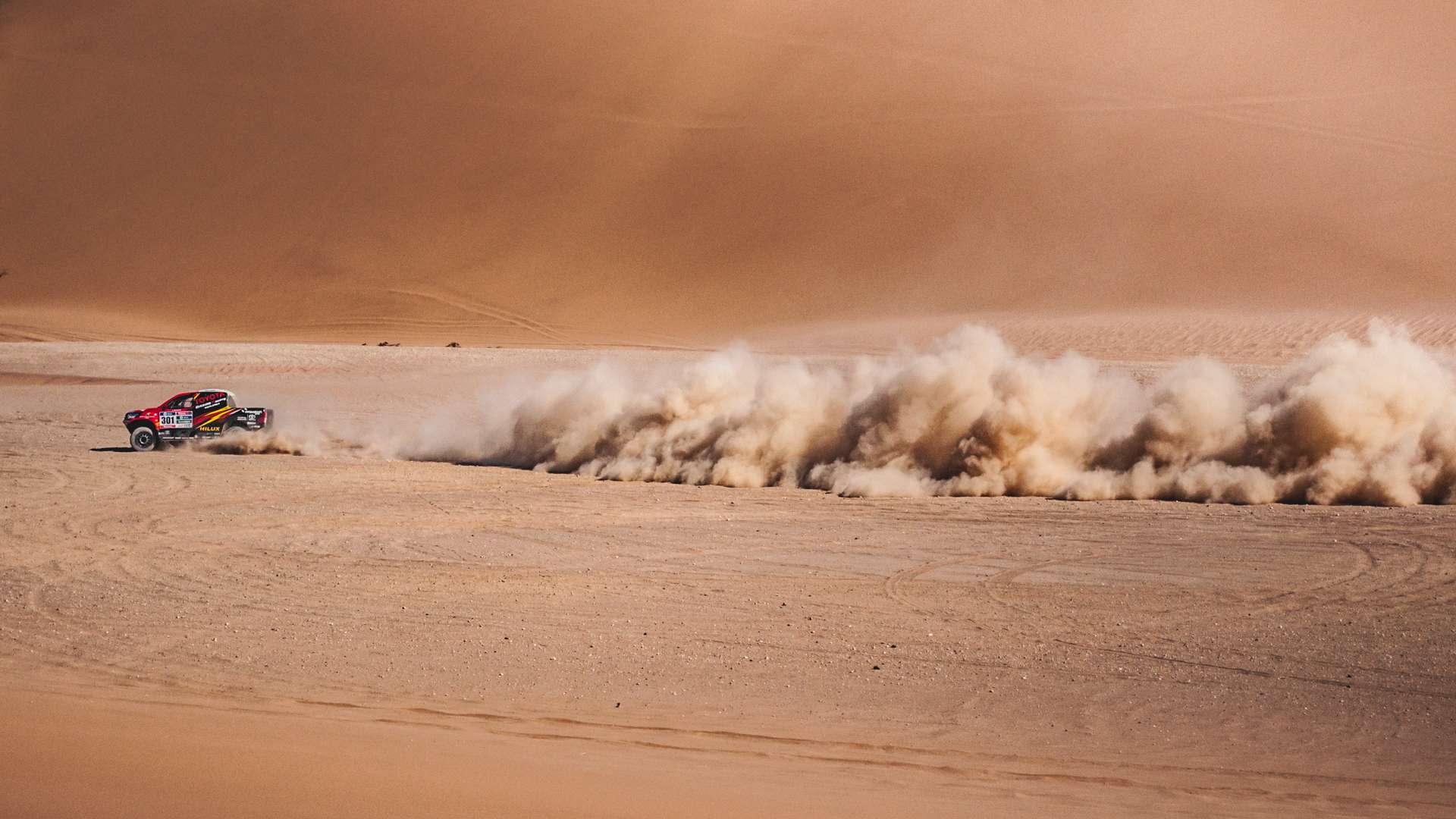 Na rozgrzewkę pokonujemy kilka mniejszych wydm i parkujemy na kawałku równego terenu. Organizatorzy mają dla nas małą niespodziankę. Skądś dochodzi donośny dźwięk silnika V8. I oto na wydmie przed nami pojawia się Toyota Hilux. Zjeżdża z niej z pełną prędkością, przejeżdża koło nas, tworząc lokalną burzę piaskową, wspina się na kolejną wydmę i znika. Za chwilę show zostaje powtórzone. Czy my też będziemy tak jeździć? Niekoniecznie - to nie był zwykły Hilux. To model Overdrive z 5-litrowym V8 o mocy 350 KM. Podobne startują w Rajdzie Dakar. Mieliśmy chwilę, by zajrzeć do wnętrza i porozmawiać z kierowcą, ale mimo miłej niespodzianki, mamy swoje sprawy. Chcemy sami spróbować walki z większymi wydmami.