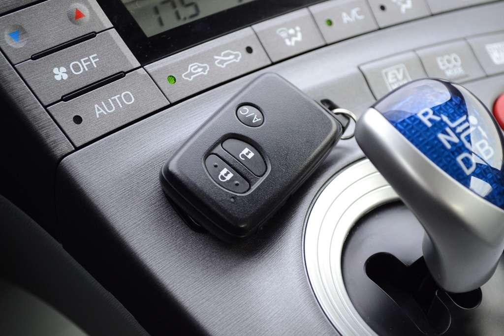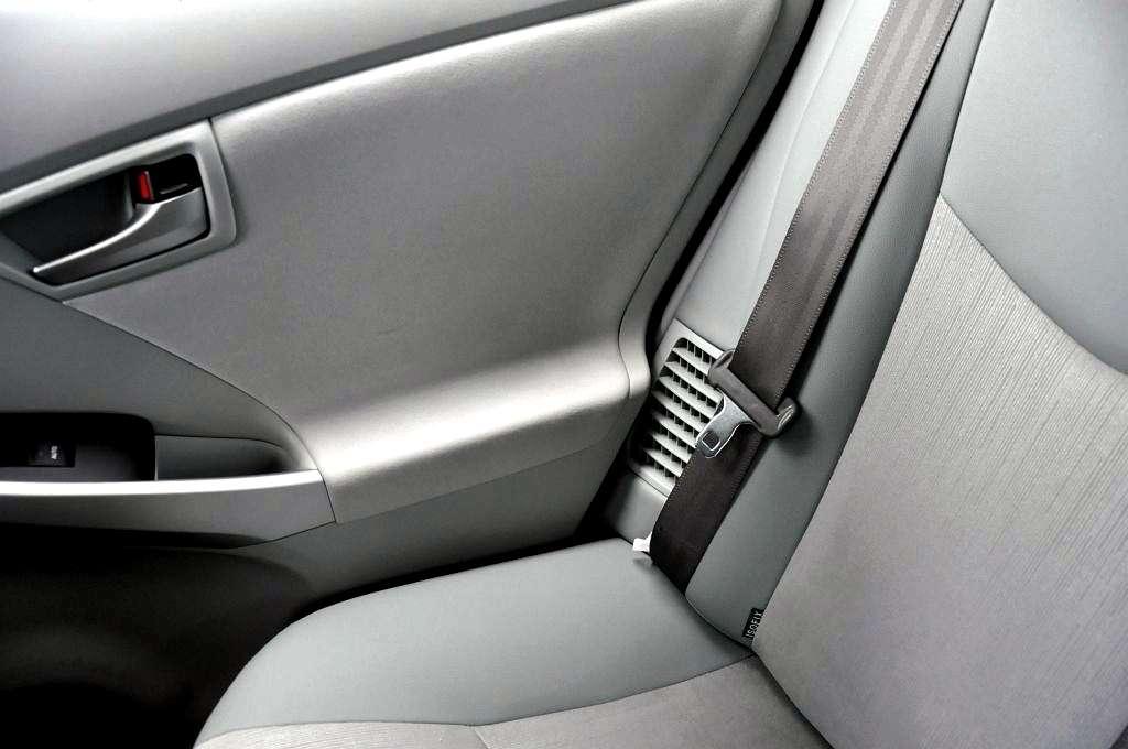 Swoją ekologiczność Toyota Prius oznajmia nie tylko zewnętrznymi, błękitnymi emblematami, ale także wnętrzem. Na pierwszy rzut oka jasna kabina Priusa wygląda ciekawie. Szczególnie podoba mi się srebrny materiał wokół ekranu nawigacji oraz skrzyni biegów. Okazuje się też, że 95 % części użytych do budowy samochodu nadaje się do odzysku. Tylko czy musi się to wiązać ze słabą jakością spasowania materiałów? Faktura plastików jest ciekawa i wyglądają one nieźle, ale w kontakcie są twarde i … skrzypią. Toyota twierdzi, że po liftingu uległy one poprawie, ale ja tego nie odczułem. Najbardziej wnerwiającym elementem jest „wiszący” tunel środkowy, który skrzypi pod naciskiem kolana (czytaj – przy każdym zakręcie). Poza tym chciałbym, żeby kluczyk wyglądał tak, abym mógł go dumnie wyłożyć na stolik w kawiarni. Tego nie wyłożę.