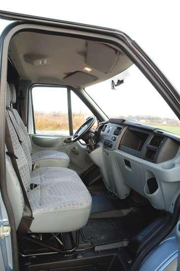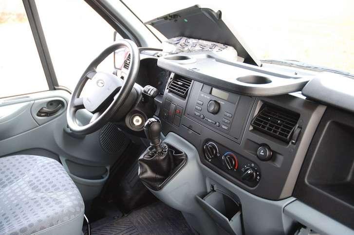 W kokpicie zagospodarowano sporo pojemnych i przydatnych schowków, m.in. na górnej części deski rozdzielczej, przed kierowcą i pasażerem. Ich pokrywy niestety nie pozostają w pozycji otwartej, lecz same opadają. Pomiędzy nimi znalazła miejsce dodatkowa półka oraz pomysłowy, składany stolik. Pierwsze wrażenie: nowy Transit ustępuje rywalom również przestronnością kabiny oraz widocznością z miejsca kierowcy. Wysoko poprowadzona deska rozdzielcza może ograniczać widoczność przy manewrowaniu, a lustra boczne nie mają powierzchni takiej, jak proponują inni producenci. Wciąż pewnym problemem pozostaje brak przestrzeni na lewą nogę – nadkole dość znacznie wnika w tę część kabiny. Dobre wrażenie wywołuje za to wyciszenie kabiny.