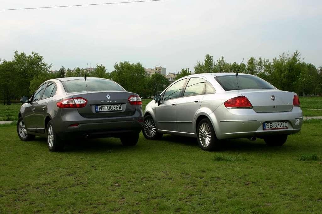 Prezentowane sedany mają stonowane sylwetki, jednak nieco bardziej eleganckie nadwozie ma Fiat, dzięki smacznym detalom, jak kształt tylnych lamp czy lusterek bocznych. Potężne kufry w obu sedanach zgrabnie wkomponowano w resztę nadwozia, co wcale nie jest takie częste w tej grupie pojazdów. Sedan Fiata, choć zaliczany jest do segmentu C, wykorzystuje płytę podłogową modelu Grande Punto, a więc auta o segment mniejszego. Płytę co prawda wydłużono o 9 cm, ale rozstaw osi tego modelu i tak jest 10 cm mniejszy niż we Fluence. Sedan Renault powstał w oparciu o płytę podłogową kombi Megane, czyli Grandtour. Wbrew przewidywaniom francuski koncern nie poszerzył palety Megane o wersję sedan, tylko wprowadził w zeszłym roku nowy model trójbryłowy – Fluence. Obecnie jest on klasyfikowany pomiędzy Megane a Laguną.