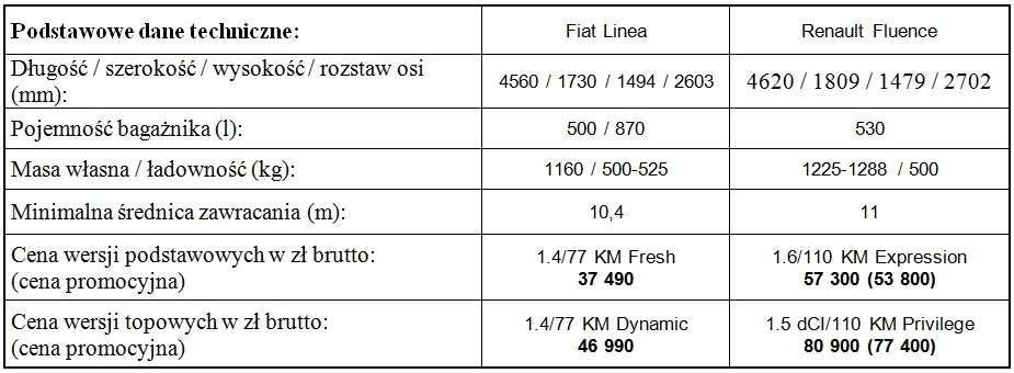 Kompaktowe sedany Fiat Linea i Renault Fluence nieprzypadkowo są produkowane w Turcji. W tym kraju oraz na całym Bliskim Wschodzie i w Rosji samochody z nadwoziami trójbryłowymi są chętnie kupowane i cieszą się dużą estymą. To właśnie do Turcji i Rosji trafiała lwia część Oplów Astra w wersji sedan powstających w Gliwicach. W Europie Zachodniej, i w coraz większym stopniu w Polsce, nadwozia tego typu wyszły z mody, choć nadal mają jedną wierną grupę nabywców – firmy flotowe. To właśnie z myślą o nich Renault wprowadziło w zeszłym roku do oferty model Fluence. Dostępny dwa lata dłużej na polskim rynku Fiat Linea kierowany jest już głównie do rodzin potrzebujących dużego i taniego samochodu.