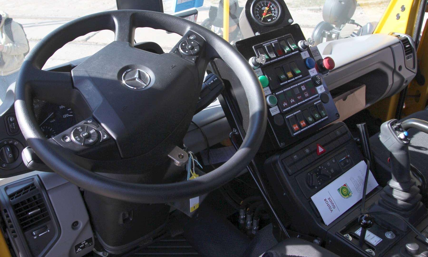 Standardowe wyposażenie Unimoga do przetaczania wagonów obejmuje m.in. instalację pneumatyczną dla hamulców wagonów, hamulec awaryjny i szerokokątne lusterka. Kierowca, choć w przypadku prezentowanego samochodu równie dobrze można mówić o maszyniście, nie może narzekać na swoje miejsce pracy. Kabina została możliwie mocno przeszklona. Nie zabrakło w niej klimatyzacji i ogrzewania. Zamawiający może dopłacić za podgrzewane fotele, ogrzewanie postojowe, radioodtwarzacz CD czy zestaw głośnomówiący Bluetooth.