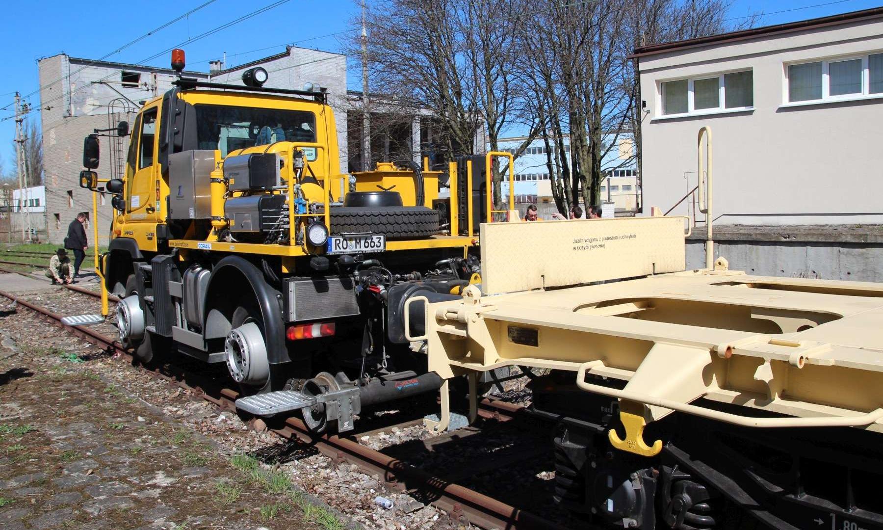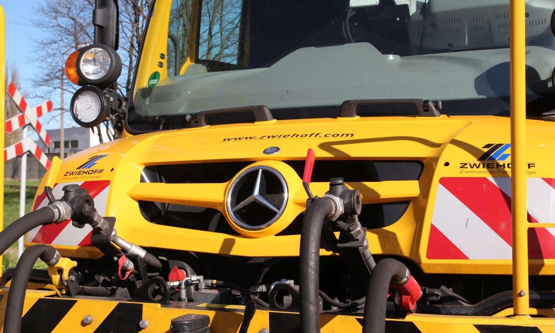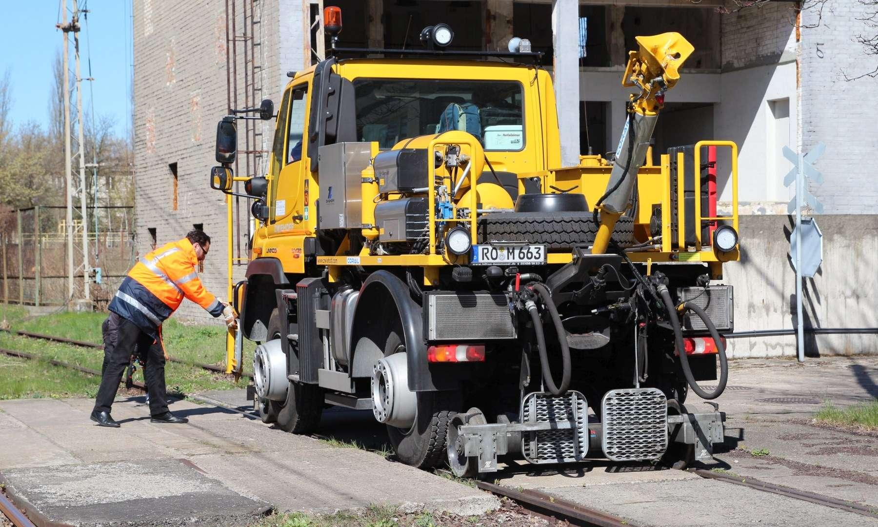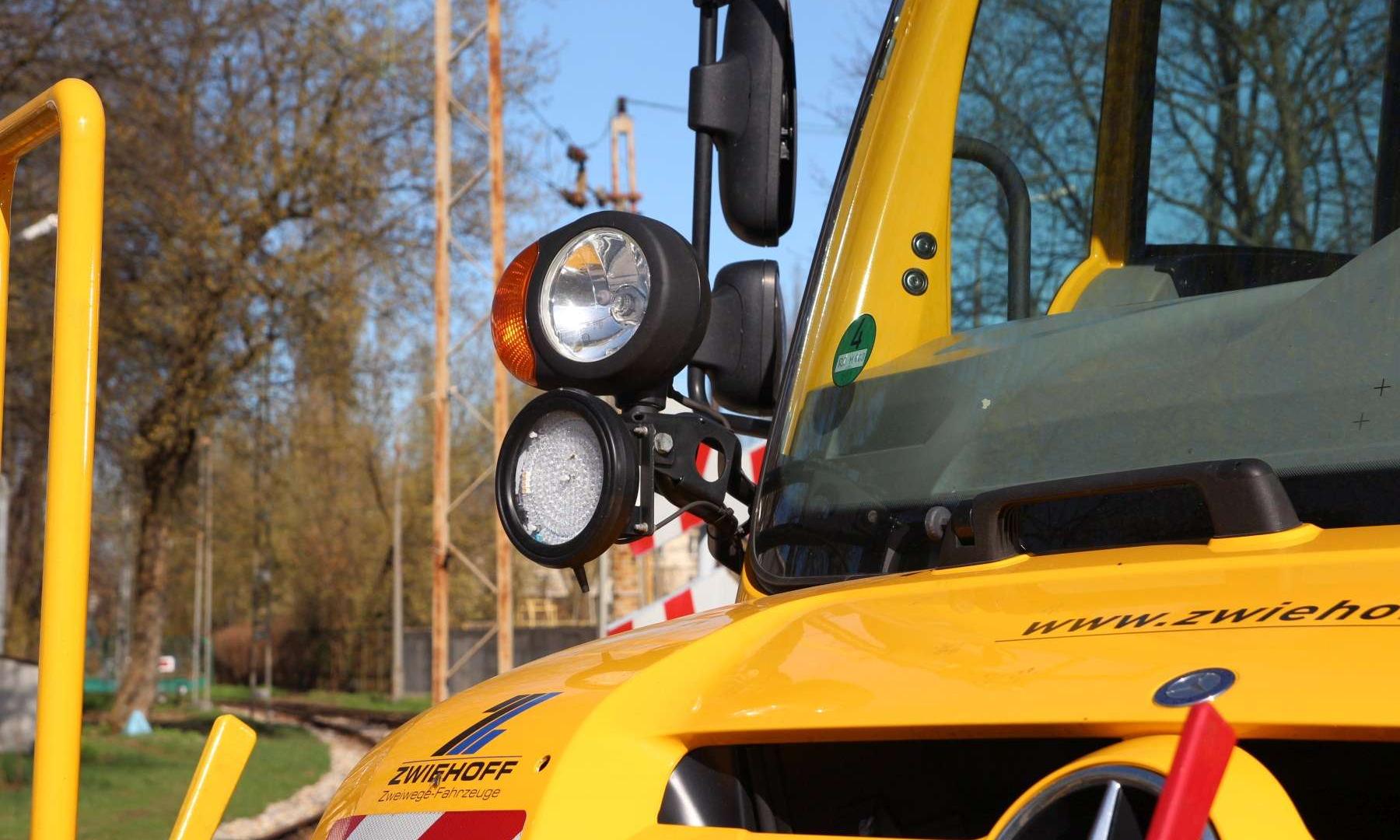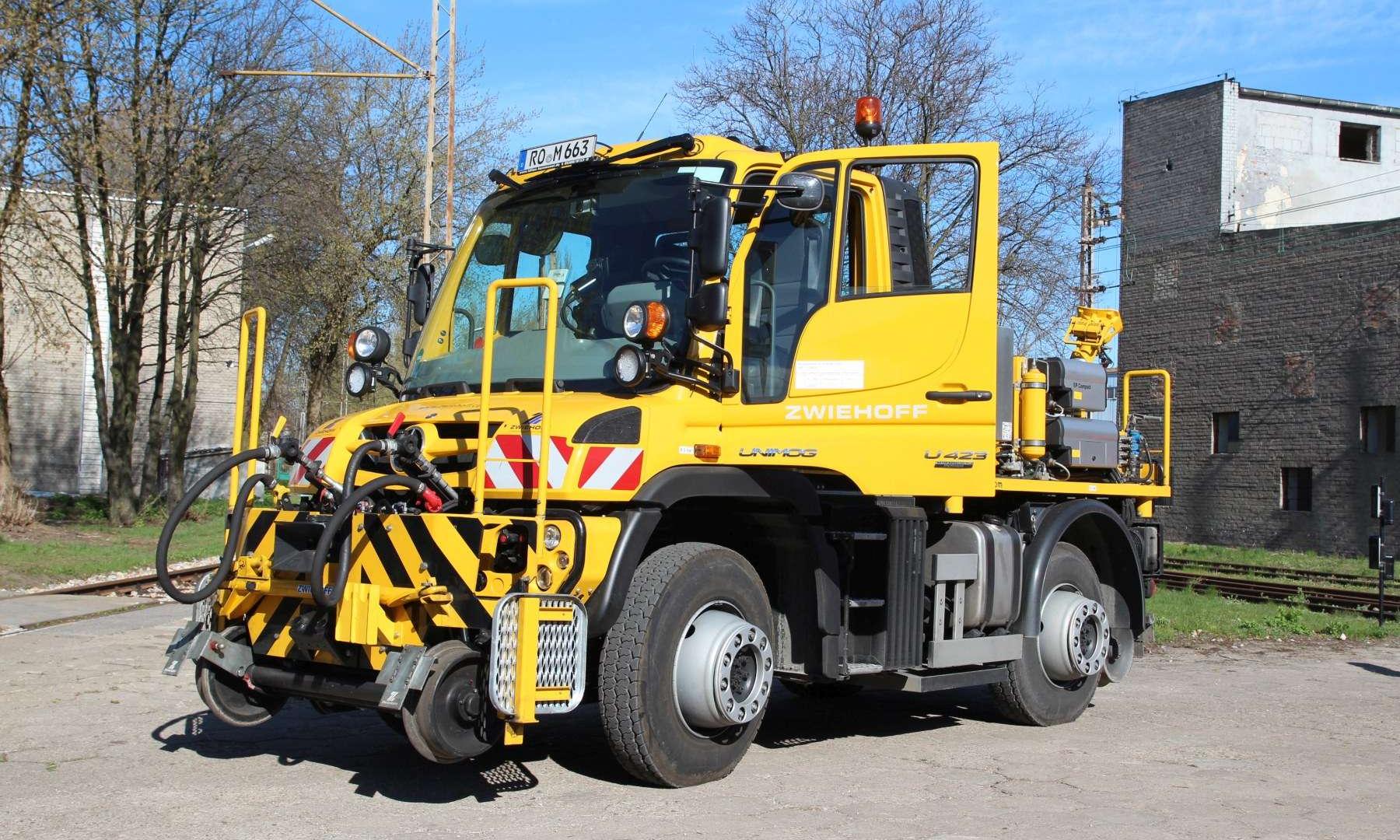 Na pierwszy rzut oka wygląda jak ciężarówka z masą osprzętu. Wprawne oczy z pewnością wychwyciły stalowe koła za przednią i tylną osią. To mechanizm prowadzący, który pozwala na jazdę wzdłuż szyn kolejowych. W jakim celu? Prezentowany Unimog jest pełnoprawnym substytutem lokomotywy manewrowej. Wystarczy kilka minut i prosty odcinek torów o długości pięciu metrów, by samochód „wpasował” się w kolejową infrastrukturę.