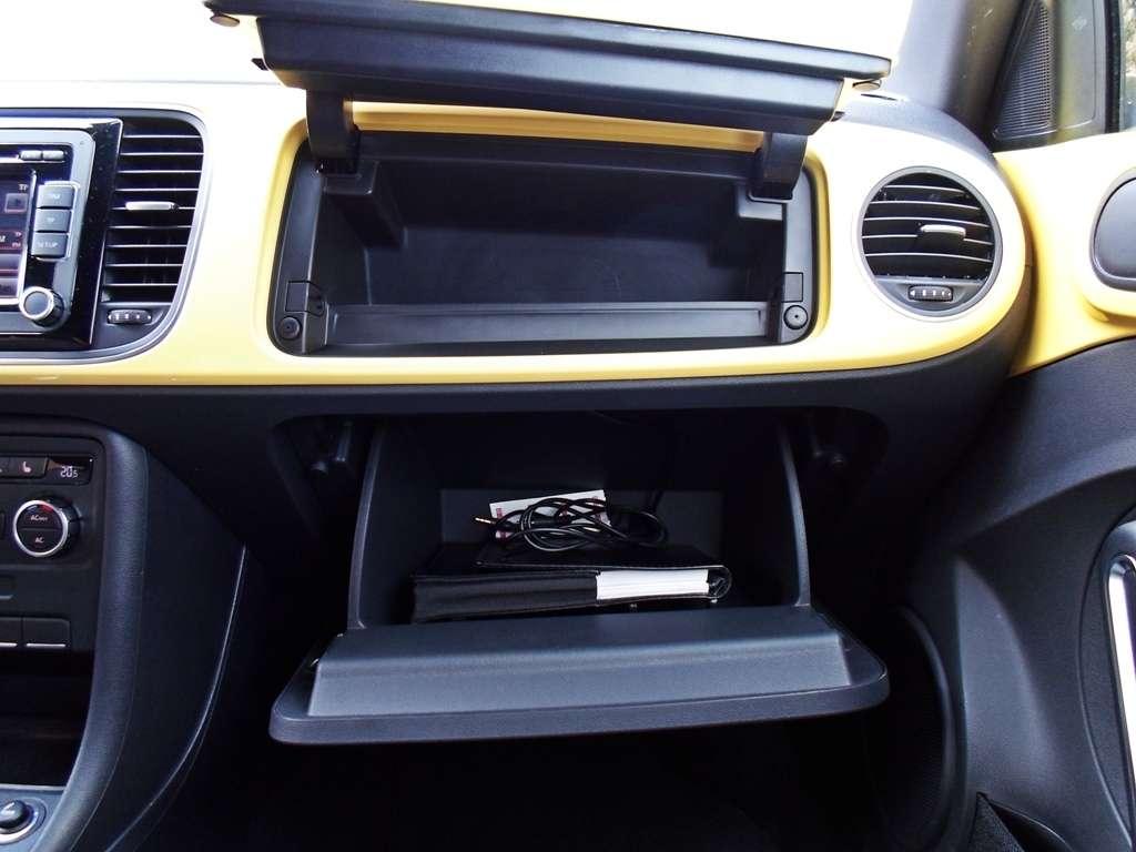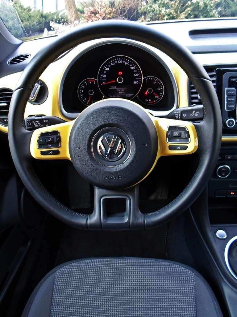 Bardzo podobają mi się żółte wstawki wewnątrz. Skutecznie imitują lakierowaną blachę, która była głównym budulcem deski rozdzielczej pierwszych Garbusów. Ten dodatek znacząco ożywia wnętrze, choć jestem świadomy, że nie wszyscy podzielą mój gust. Na słowo uznania zasługuje schowek przed pasażerem, który również jest nawiązaniem do starych, dobrych czasów. Poniżej znajduje się jeszcze jeden większy, więc w Beetle'u nie zabraknie miejsca na drobiazgi. Kierowcy natomiast może nie wystarczyć cierpliwości do korzystania z uchwytów na kubki, które umieszczono pod podłokietnikiem. Sięganie po kubek kawy jest wyjątkowo niewygodne. Picie latte jest modne, więc hipster z niej zrezygnuje, ale wodę musi pić każdy. Rozczarowałem się jakością plastików wewnątrz. Volkswagen przyzwyczaił mnie do dużej ilości miękkiego tworzywa, ale w Beetle'u znalazłem tylko to twarde. Jakość montażu nie budzi wątpliwości. Całe wnętrze wydaje się mieć trochę za mało odwołań do klasyki. Zastosowane rozwiązanie przypomina podłączanie zegara z wahadłem do prądu. Działa niezawodnie, ale gdzie podział się duch przeszłości?