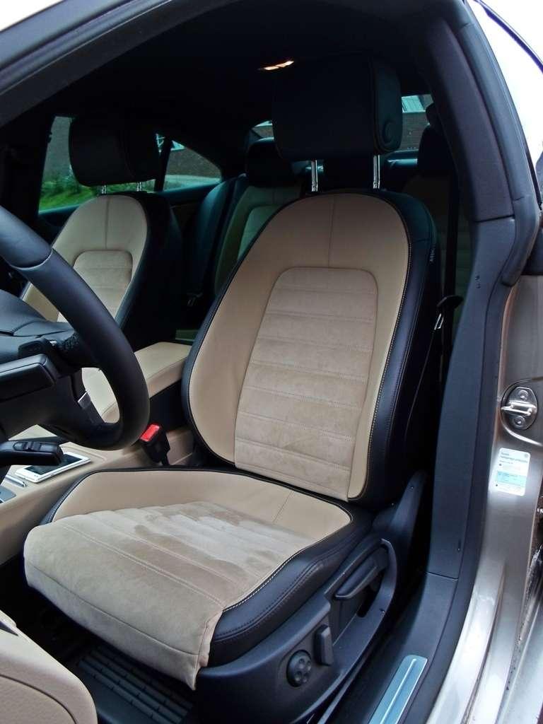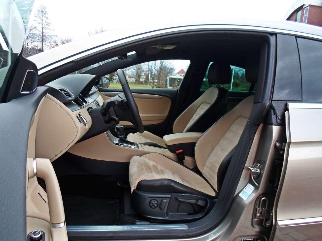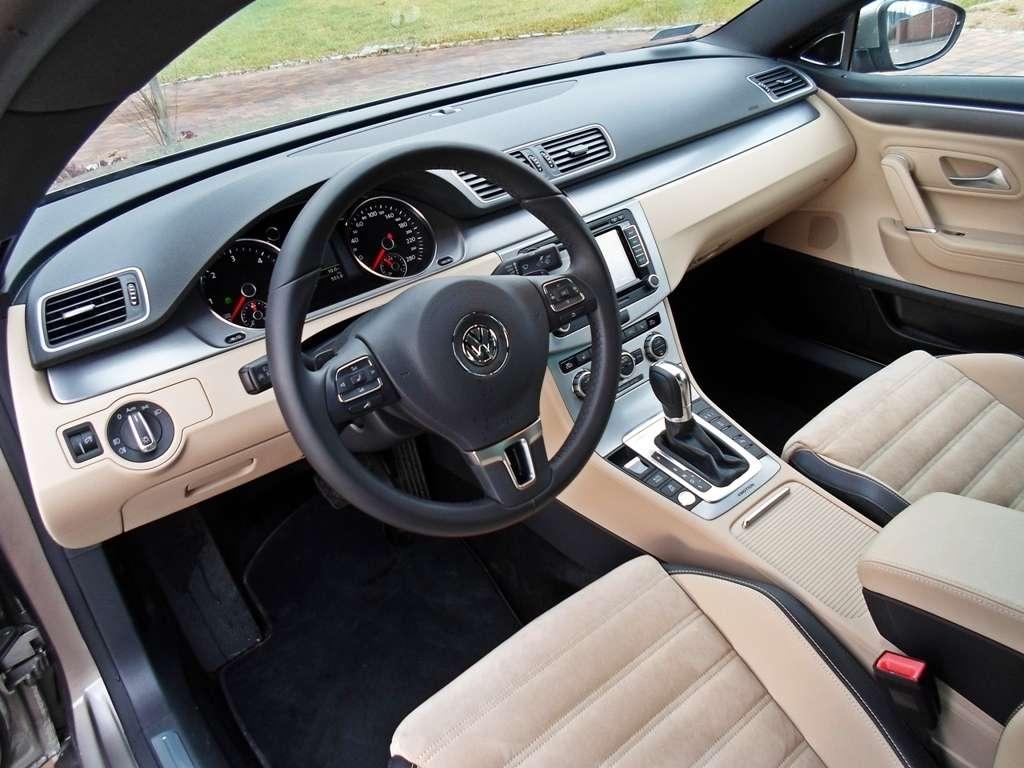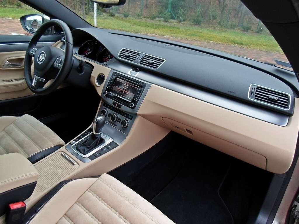 Wspomniałem już o naprawdę ładnie zarysowanej karoserii CC, ale jakie odczucia towarzyszą kierowcy po zajęciu miejsca w kabinie? Cóż, już tak emocjonująco nie jest. Owszem wnętrze można określić jako poukładane, schludne, ergonomiczne, ale jak dla mnie zbyt spokojne i zdecydowanie nienadążające za nadwoziem. Czuć tu typowo volkswagenowskiego ducha, który przenika do umysłu kierowcy i po początkowej ochocie na szaleństwa nieco go uspokaja. Czy to źle? To zależy, niemniej jednak w tej kabinie kierowca może dobrze się poczuć za sprawą idealnej ergonomii i logicznemu rozmieszczeniu przycisków. Wszystko działa dokładnie tak jak chcą tego nasz umysł i palce. Jakość montażu nie pozostawia wiele do życzenia, trudno zmusić którykolwiek z plastików do wydawania hałasów, ale tworzywa mogłyby być nieco miększe. Na słowa uznania zasługują fotele, których idealne wyprofilowanie sprawdza się zarówno w trasie jak i w zakrętach. Dodatkowo połączenie skóry z alcantarą sprawia, że wnętrze nabiera charakteru oraz skuteczniej utrzymuje nasze pośladki w miejscu podczas pokonywania ciasnych łuków.