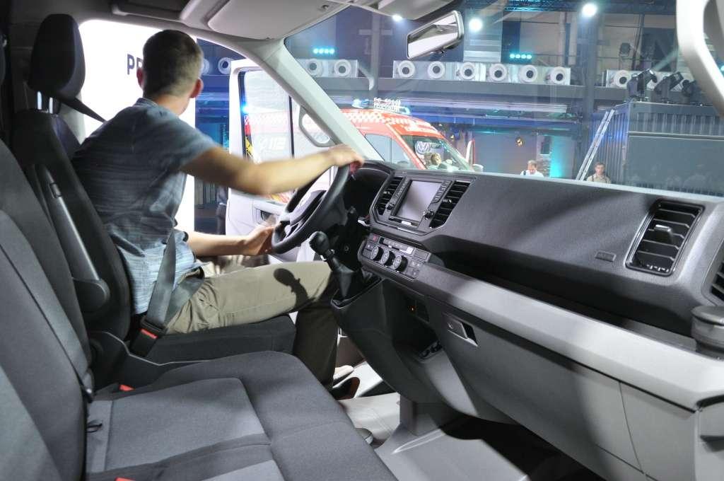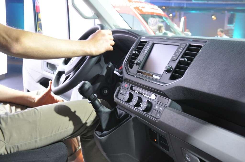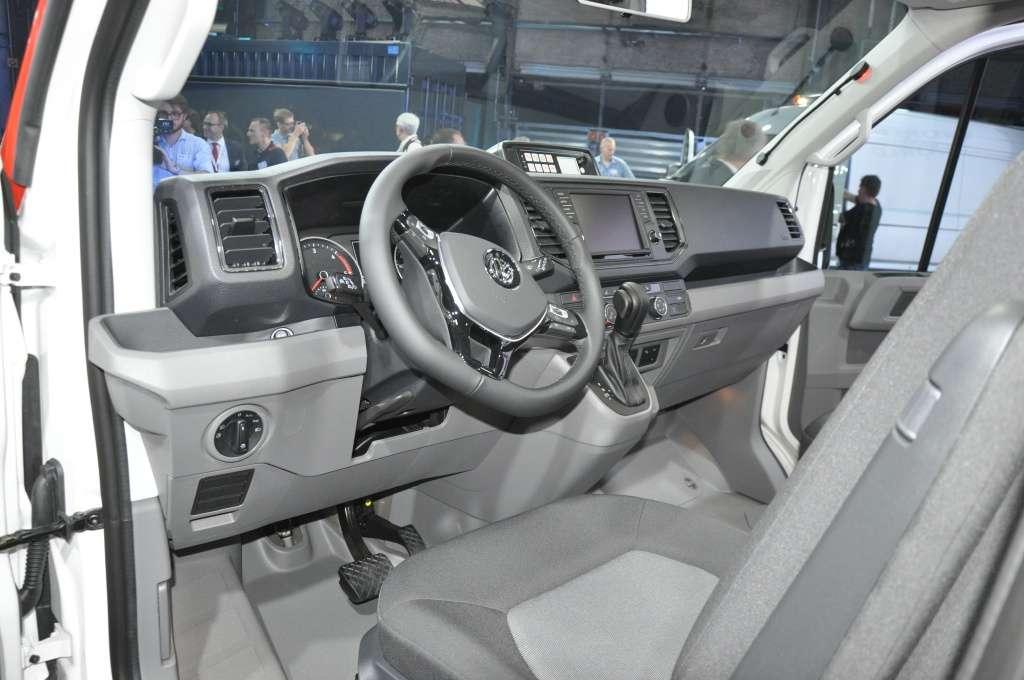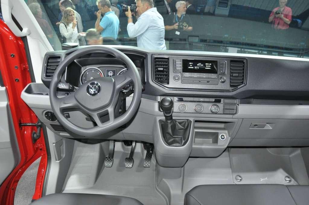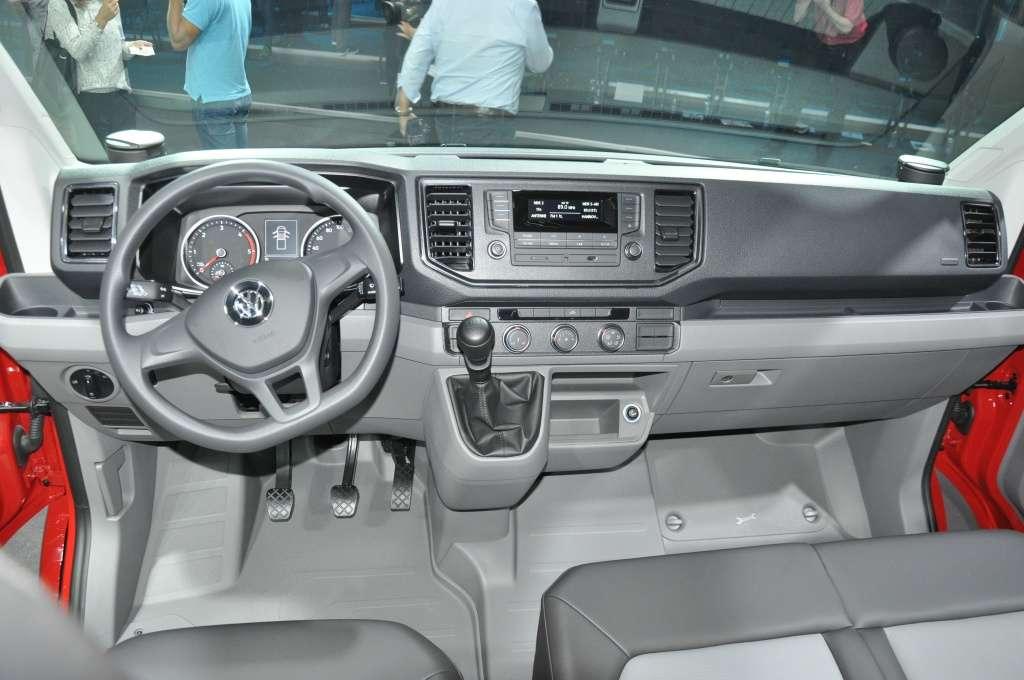 Wnętrze, podobnie jak nadwozie, reprezentuje typowy dla Volkswagena styl. Koło kierownicy, tablica wskaźników, czy panele deski rozdzielczej to elementy kojarzące się tylko z jedną marką i ciężko jest Craftera pomylić z jakimkolwiek innym modelem. Przy zachowaniu podobieństwa do mniejszych modeli udało się jednocześnie nadać wnętrzu typowo użytkowy charakter. Deska rozdzielcza podzielona jest niejako na dwa poziomy. Dzięki temu udało się wygospodarować sporo miejsca na różnego rodzaju drobiazgi. Na podszybiu umieszczono dwa zagłębienia na kubki, gniazdo USB z lewej strony i gniazdo 12V z prawej. W dolnej części umieszczono kolejne dwa gniazda 12V. Zamykany schowek przed siedziskiem pasażera jest tak duży, że pomieści nawet spory segregator.