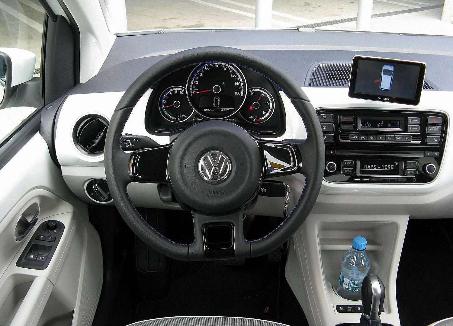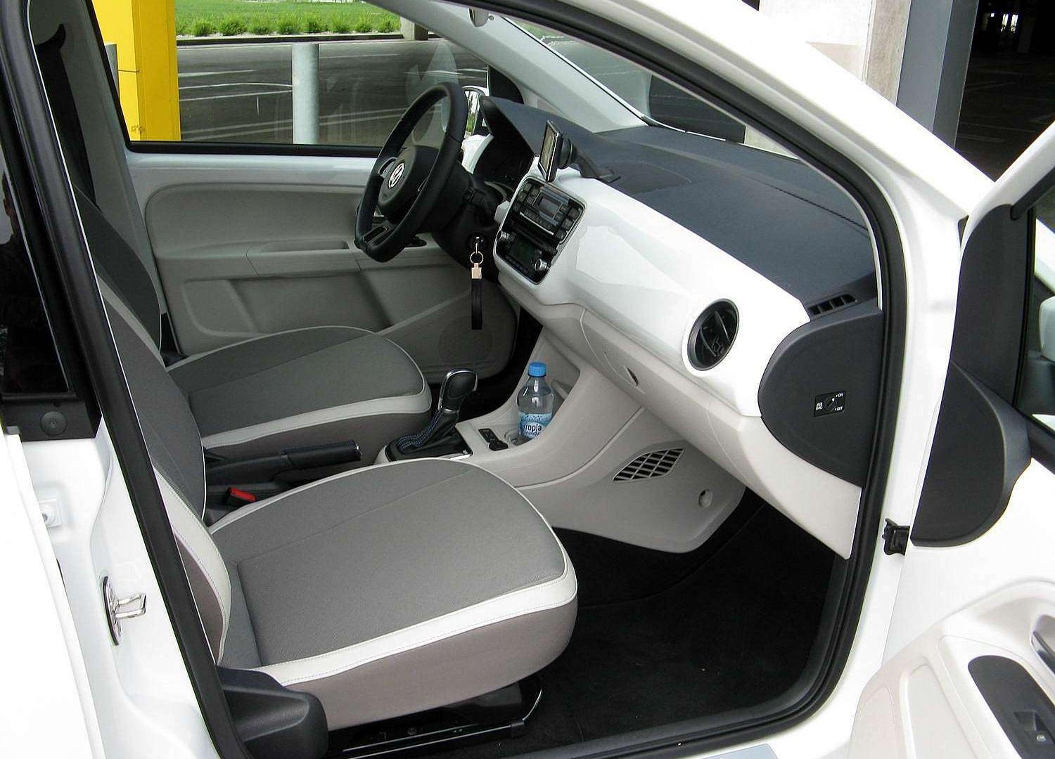 e-Up! tak naprawdę niewiele różni się od zwykłego Up!’a. Mimo tego dość łatwo można go rozpoznać. Szczególnie na parkingu, gdy nagle i bezszelestnie wyłoni się za waszymi plecami oraz wzbudzi panikę. Mimo tego stylistyczne akcenty też są dość charakterystyczne. Volkswageny, które mają sporo wspólnego z prądem, posiadają specyficzny układ świateł do jazdy dziennej w kształcie litery „C”. W e-Up!’ie nie mogło zabraknąć tego elementu i został zgrabnie wkomponowany w przedni zderzak. Podobny wzór z tyłu tworzą odblaski. Coś jeszcze się zmieniło? Prócz drobnych poprawek aerodynamicznych oraz niebieskich akcentów, nowe są 15-calowe alufelgi. Innych dodatków tak naprawdę próżno szukać. Co z wnętrzem?