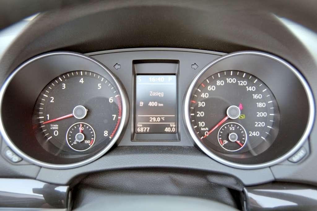 Wsiadamy i... czujemy się jak w domu. Kabina została w całości przeniesiona z Golfa VI. Z jednej strony oznacza to świetne materiały i dbałość o szczegóły – np. miękko wyściełane kieszenie boczne. Upływu czasu zamaskować jednak nie sposób. Kto miał do czynienia Golfem VII, czy nawet nową generacją aut z Korei, nie zostanie rzucony na kolana. Przy dokładnych oględzinach stwierdzimy, że wszystko jest dobre, ale mogłoby być... nieco lepsze. Dotyczy do zarówno tworzyw, jak i systemu multimedialnego z nawigacją, który potrafi irytować powolnością działania. Najmniejszych wątpliwości nie budzi ergonomia, przejrzystość kokpitu czy łatwość obsługi poszczególnych funkcji samochodu. Fotele – świetne, chociaż trzeba podkreślić, że testowany Golf otrzymał opcjonalne, sportowe siedzenia z mocniej wyprofilowanymi boczkami, regulacją podparcia lędźwiowego oraz dwukolorową tapicerką.