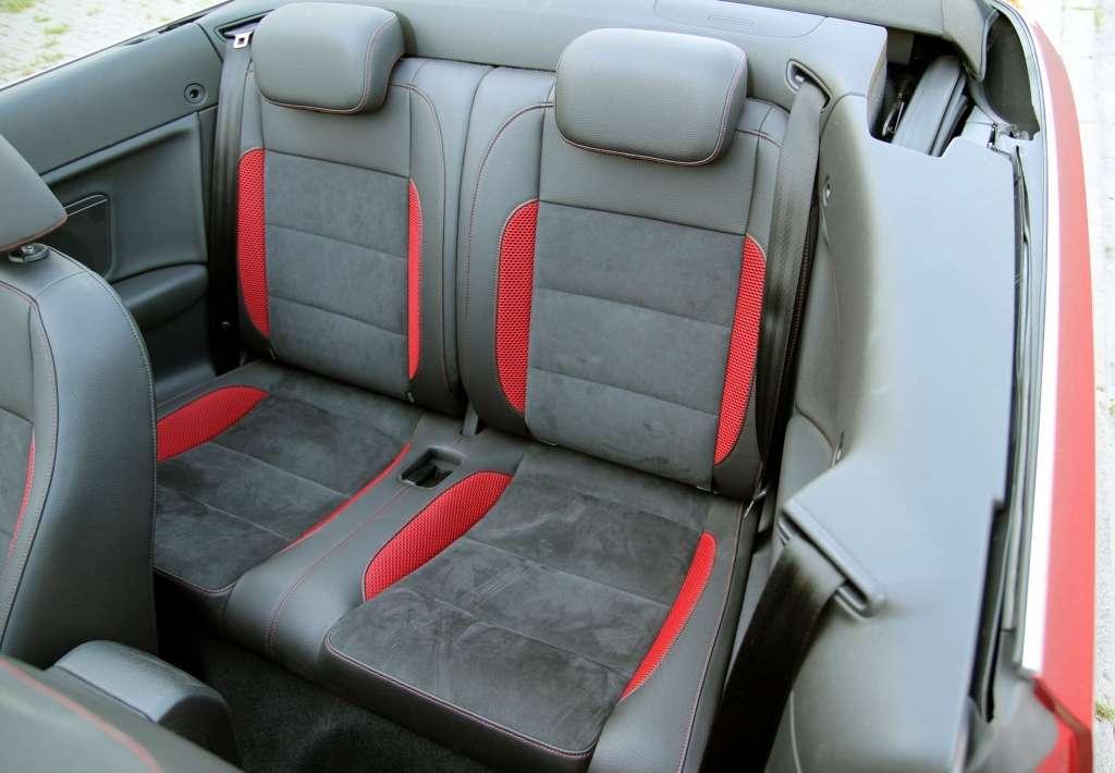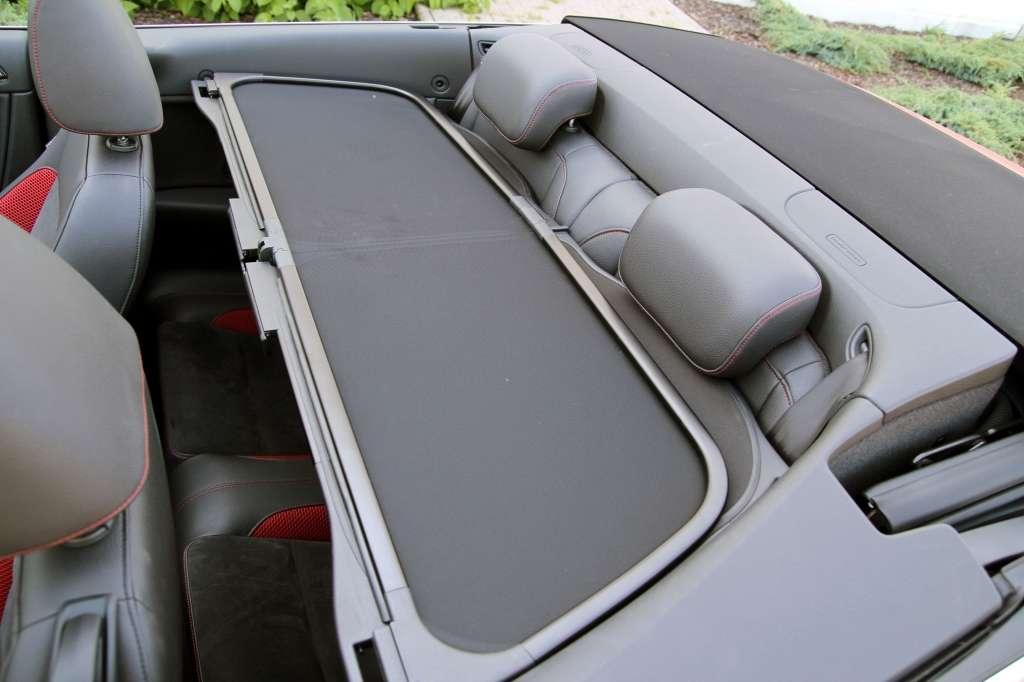 Konieczność wzmocnienia nadwozia oraz ukrycia w nim mechanizmu składania dachu ograniczyły ilość miejsca z tyłu. Zamiast 3-osobowej kanapy mamy dwa siedzenia z mizerną przestrzenią na nogi. Odpowiednio manipulując położeniem przednich foteli uzyskamy miejsce dla czterech osób. Komfortowo jednak nie będzie. Warto też dodać, że drugi rząd sprawdza się wyłącznie podczas jazdy z podniesionym dachem. Kiedy go rozłożymy, nad głowami pasażerów rozpęta się huragan, którego namiastki nie doświadczymy z przodu nawet w trakcie podróży z maksymalną prędkością.