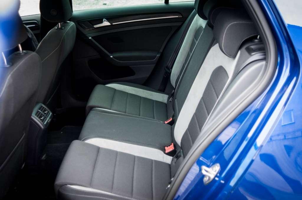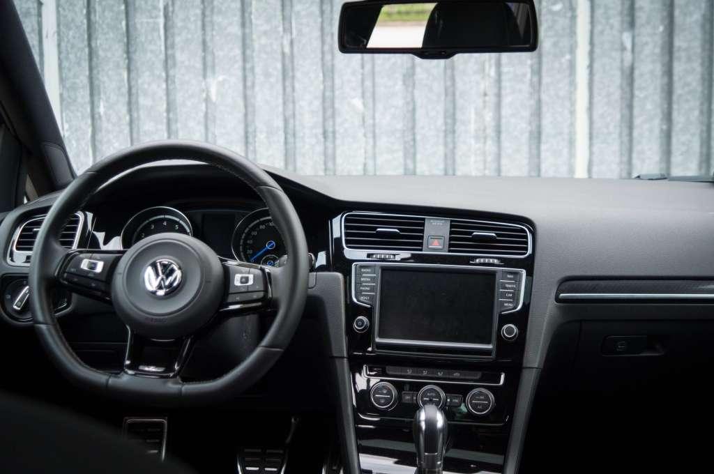 Jak Golf R ubrał się na nasze spotkanie? W testowanej przez nas wersji znajdziemy wykończenie zwane „Race”. Obejmuje ono fotele obszyte Alcantarą i w większości czarne wnętrze. Czarna jest deska rozdzielcza, czarna podłoga, a także czarna podsufitka. Osoby ze sportowym duchem czują się tu dobrze, ale część klientów pewnie zdecyduje się na skórę. Tę można zamówić w trzech wariantach. „Vienna” kosztuje 7 990 zł i jest w całości czarna, z logiem „R” na oparciach siedzeń. „Nappa Carbon” to najlepsza gatunkowo skóra, dostępna w dwóch kolorach – pełna czerń i ze środkiem w kolorze antracytowym. Jedna i druga wygląda świetnie, w dodatku, zarówno do Vienny, jak i do Nappa Carbon, w standardzie dodawane jest podgrzewanie przednich foteli. Fotele są bardzo głębokie, a ścianki boczne zapewniają trzymanie godne samochodu sportowego. Może nie wsiada się tutaj najłatwiej, ale kiedy już siedzisz i szybko pokonujesz zakręt, dziękujesz inżynierom za takie, a nie inne rozwiązanie.