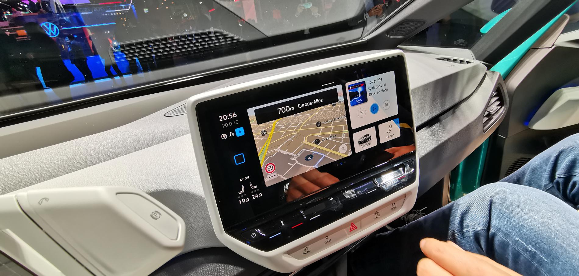 Rewolucja musi mieć swoje ofiary – tutaj ofiarą padł odwiecznie obecny w Volkswagenach przełącznik świateł. W rodzinie ID charakterystyczne pokrętło nie będzie już obecne, tak samo jak wszystkie inne fizyczne przyciski. Cóż, nowoczesność to ekrany dotykowe, na których steruje się wszystkimi funkcjami samochodu. W tym przypadku kierowca ma swój własny ekran zamiast zegarów. Jego forma jest zaskakująco prosta - nie otacza go żaden daszek przypominający tradycyjne wskaźniki, co łudząco przypomina rozwiązanie z BMW i3. Linia deski rozdzielczej poprowadzona jest nisko dla spotęgowania wrażenia przestrzeni i widoczności. Na ogół wnętrze ID.3 pozbawione jest jakichkolwiek ozdobników, ale z jednym wyjątkiem. Aluminiowe nakładki na pedały udekorowano symbolami play i pause – ciekawy, niebanalny akcent.