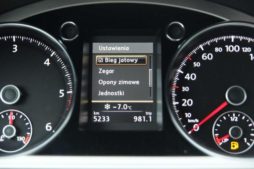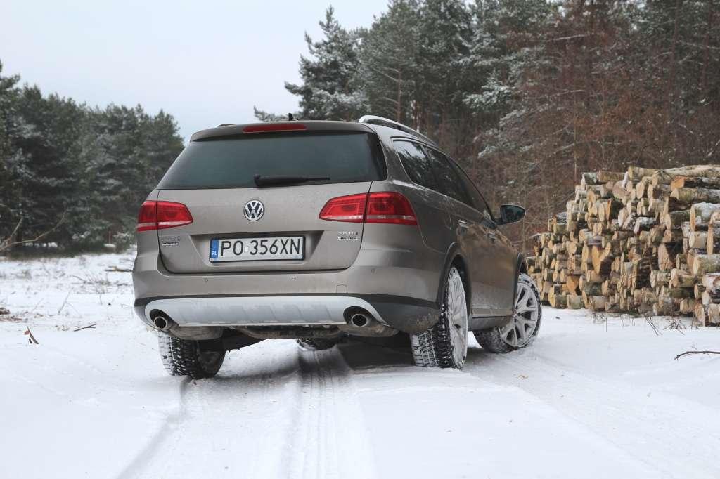 Tryb terenowy został przeniesiony z Tiguana. W Alltracku jest mniej przydatny - prześwit zmodyfikowanego Passata to skromne 165 mm. Nie pozwala na walkę z bezdrożami, ale w zupełności wystarcza do jazdy po łące bądź zniszczonej lub mocno zaśnieżonej drodze. W takich warunkach Alltrack radzi sobie doskonale nawet bez trybu Off Road. Zwiększony prześwit ułatwia podjeżdżanie pod krawężniki, a na zniszczonych drogach nie trzeba obawiać się o stan podwozia czy miski olejowej. Zmodyfikowane zawieszenie nie poprawiło jednak komfortu jazdy. Wręcz przeciwnie. Alltrack filtruje nierówności mniej subtelnie od zwykłego Passata. Komfort jazdy testowanym egzemplarzem na pewno byłby wyższy, gdyby samochód posiadał standardowe koła 225/50 R17, a nie opcjonalne 225/45 R18. Warto dodać, że fabrycznym wyposażeniem Alltracka są samouszczelniające się opony. Producent deklaruje, że wbite w czoło bieżnika ciała obce o średnicy do 5 mm zostaną otoczone polimerową masą o dużej gęstości, która uszczelni uszkodzone miejsce i nie dopuści do utraty ciśnienia. Jeżeli obiekt zostanie wyciągnięty, półpłynny kauczuk powinien zasklepić otwór w oponie. Jeżeli tak się nie stanie, można skorzystać z koła dojazdowego.