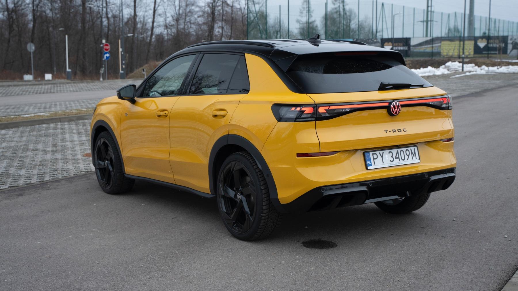 Parę słów powiem natomiast o testowanej konfiguracji, która bardziej przypadła mi do gustu od sprawdzanego wcześniej białego egzemplarza. Testowany samochód również trafił do mnie w wersji R-Line, jednak różnił się kolorem i wzorem felg. Żółty lakier "Canary" z czarnym dachem (2050 zł) w połączeniu z czarnymi dodatkami pakietu Black Style (2730 zł) w postaci wykończenia grilla, wstawek na zderzakach czy listw wokół szyb, czyni z niego rzucającego się w oczy miejskiego "zawadiakę". Do dziarskiego stylu nowego T-Roca R-Line pasują olbrzymie, aż 20-calowe czarne felgi o wymyślnym wzorze Calgary (2530 zł), które w połączeniu z resztą elementów pakietu R-Line sprawiają, że auto prezentuje się niczym podniesiony hot hatch. Z drugiej strony w mieście tak duże koła są totalnie niepraktyczne.