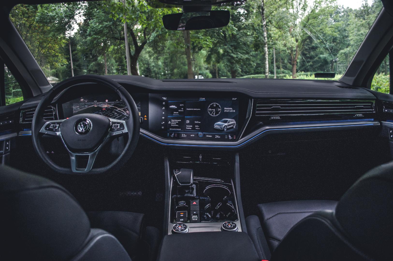 Pomijając jednak kwestie technologii, Volkswagen Touareg robi wrażenie również wewnątrz. Skóra jest naprawdę wysokiej jakości, projekt deski rozdzielczej przemyślany, a ilość miejsca w całej kabinie nie pozostawia wiele do życzenia.