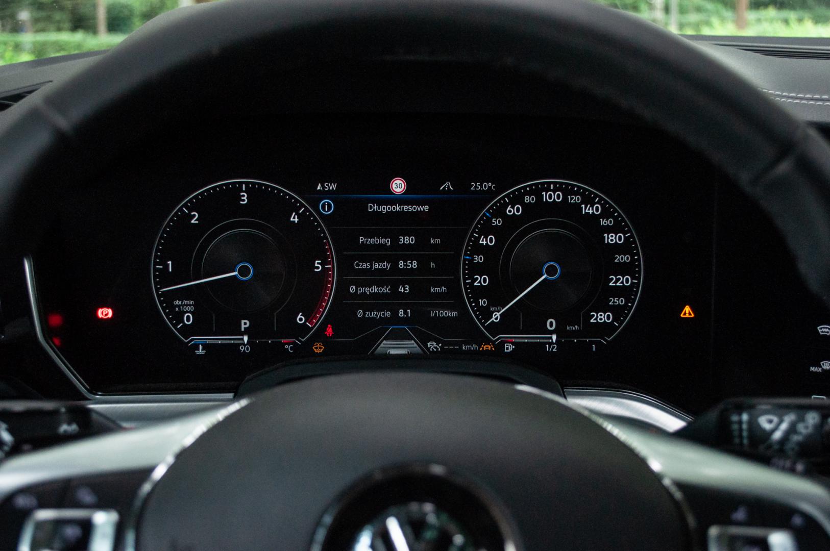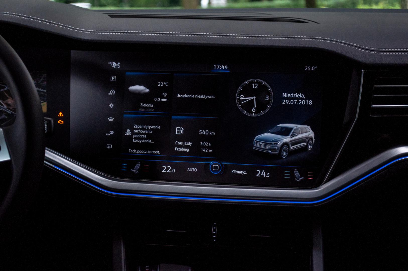Już w standardzie dostajemy jednak system multimedialny z dużym ekranem i spory wyświetlacz komputera pokładowego pomiędzy analogowymi zegarami. Największe wrażenie robi jednak w Touaregu system Innovision Cockpit z 15-calowym ekranem. Razem z zestawem wirtualnych zegarów, tworzą wrażenie siedzenia w samochodzie z tej przyszłości, o której mówi wiele osób. Tutaj faktycznie ekrany zastąpiły praktycznie wszystkie fizyczne przyciski. Zostały tylko pokrętła wyboru trybu jazdy i dźwignia służąca do obsługi automatycznej skrzyni biegów – chociaż ta również nie ma już połączenia z prawdziwą skrzynią. Zapomniałbym dodać – Innovision Cockpit kosztuje 18 tys. zł.