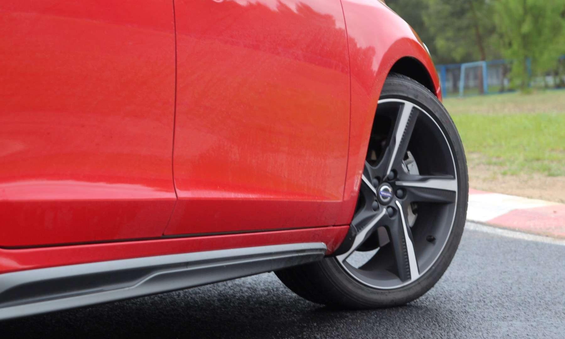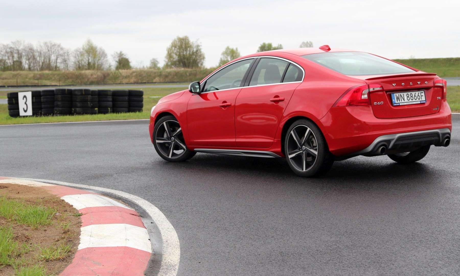 Pakiet R-Design składa się z dodatków aerodynamicznych, które podkreślają i tak muskularną bryłę nadwozia Volvo S60. Wprowadza także sportowe akcenty do wnętrza – metalowe nakładki na pedały, aluminiowe listwy dekoracyjną, lepiej leżącą w dłoniach kierownicę, czarną podsufitkę czy mocniej wyprofilowane fotele z tapicerką złożoną ze skóry i alcantary. Na torze przydatne były głównie... niewidoczne składowe pakietu R-Desing. Mowa o amortyzatorach z wyższą siłą tłumienia, sztywniejszych i krótszych o 15 mm sprężynach, grubszych stabilizatorach, twardszych tulejach metalowo-gumowych czy rozpórce przednich kielichów. Tak doposażone S60 szybciej i precyzyjniej reaguje na komendy wydawane kierownicą. Odpowiedni zapas przyczepności zapewniają koła w rozmiarze 235/40 R19. Na pokładzie jest też Corner Traction Control, czyli elektroniczna „szpera”, która poprzez hamowanie wewnętrznego do łuku koła przekazuje większy moment obrotowy na zewnętrzną, bardziej przyczepną oponę. Rozwiązanie poprawia trakcję oraz ogranicza tendencję do podsterowności.