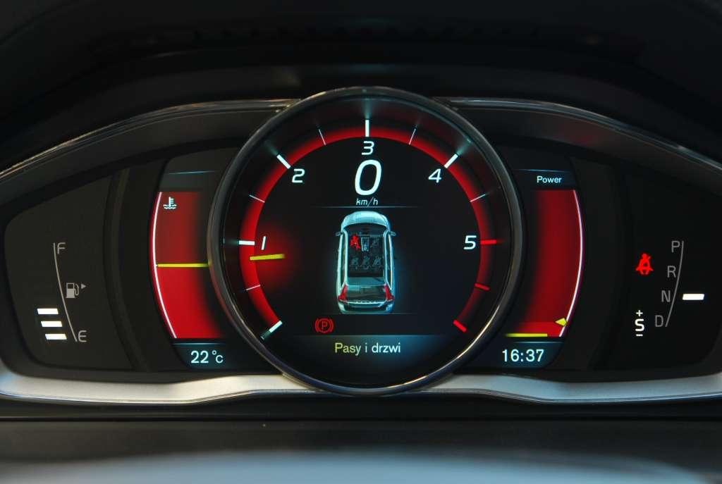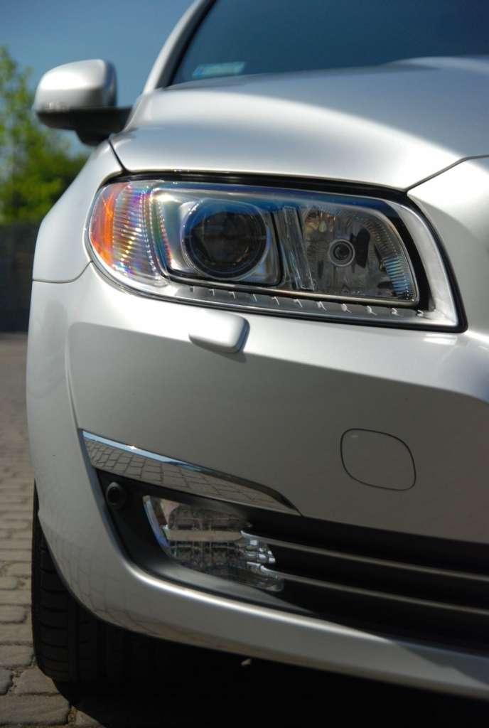 Bardzo dobre wrażenie robią skrętne światła ksenonowe. W chwili kiedy skręcamy (nawet delikatnie) widzimy jak światło podąża w kierunku skrętu rewelacyjnie doświetlając drogę. Systemy odpowiedzialne za bezpieczeństwo w V70 oferują nam szereg rozwiązań, które ułatwiają jazdę. Poza czujnikiem parkowania czy tempomatem (które działają bez zastrzeżeń) Szwedzi oferują nam m.in. system BLIS, czyli ostrzeżenie o pojazdach w martwym polu lusterek. Tym samym, jeśli w martwym polu znajduje się jakiś pojazd, system ostrzega nas światełkiem zamontowanym z lewej i prawej strony w kabinie V70. Podobnie sytuacja ma się w przypadku, kiedy zbyt szybko (wg auta) zbliżamy się do innego pojazdu przed nami, lampka znajdująca się za tablicą rozdzielczą zaczyna zwracać uwagę o potencjalnym niebezpieczeństwie. Czym szybciej podjeżdżałem do jakiegoś samochodu tym bardziej lampka dawała o sobie znać zmieniając kolor od pomarańczowego po czerwony. Innym sposobem walki z drobnymi kolizjami, jakich na drodze jest najwięcej, jest system City Safety. Dzięki niemu auto jadące do 50 km/h automatycznie zwolni, lub zahamuje, w przypadku, kiedy na drodze pojawi się niespodziewana przeszkoda. W dłuższych trasach, trwających wiele godzin, bardzo przydatny może okazać się układ kontroli pasa ruchu, który informuje nas o zagrożeniu zjechania z naszego pasa w trakcie jazdy powyżej 65km/h. Kolejny plus V70 zyskuje za działanie nawigacji. Po wybraniu trasy, komputer zaoferował mi trzy trasy do wyboru: szybką, krótką oraz ekologiczną. GPS jest bardzo czytelny, kiedy zbliżamy się do skrzyżowań na LCD widzimy obraz dzielony na połowę. Z jednej strony mamy przybliżony obraz skrzyżowania, natomiast z drugiej zwykły obraz dalszej trasy. W każdym momencie możemy oddalić lub przybliżyć obraz za pomocą jednego pokrętła. Kolejnym rozwiązaniem, które znajdzie swoje zastosowanie szczególnie z chłodne dni są podgrzewane fotele – fotele nagrzewają się szybko, zwiększając przyjemność z jazdy. Ciekawostką jest możliwość zmiany wyglądu zegarów, do wyboru mamy trzy opcje: Elegance, ECO oraz Performance. Każdy z tych trybów ma swój unikalny wygląd i np. tryb ECO pozwala kontrolować jazdę, aby ta była jak najbardziej ekologiczna.
