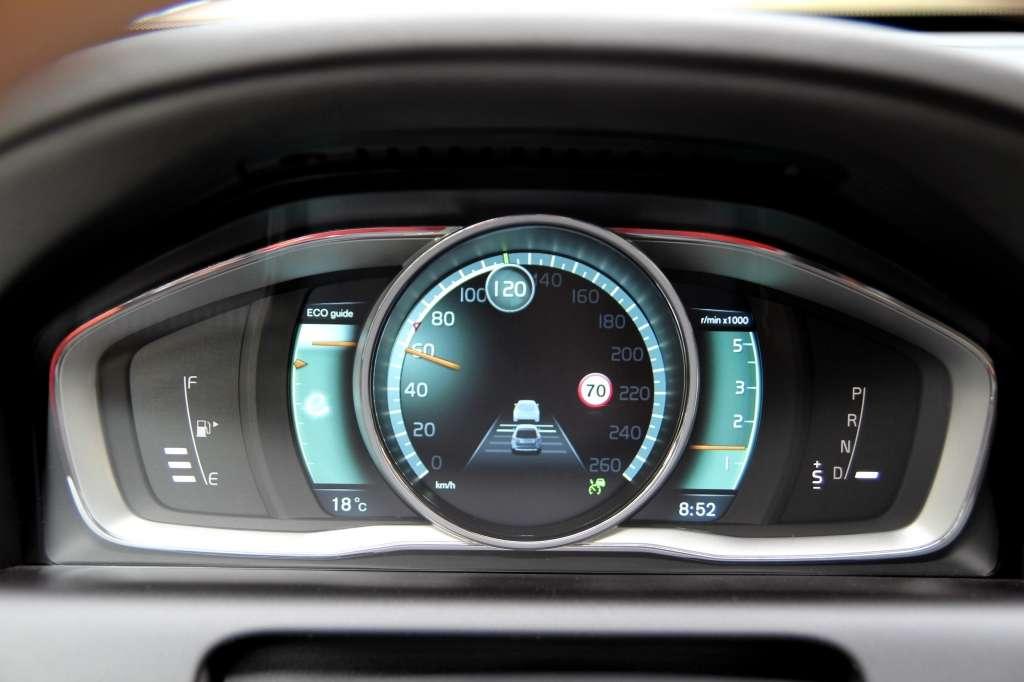 Testowane XC60 posiadało system rozpoznawania znaków drogowych oraz aktywny tempomat. Działania obu systemów nie trzeba chyba nikomu tłumaczyć. Na uwagę zasługuje to, co dzieje się na panelu wskaźników. Komputer nakłada na skalę prędkościomierza informacje o ograniczeniu prędkości (czerwony znacznik), zadanej prędkości jazdy oraz różnicy między prędkością naszego i poprzedzającego pojazdu (dodatkowy pasek na skali prędkościomierza). Różnica prędkości jest prezentowana, gdy samochody dzieli ok. 80 m. Informacja jest bardzo dokładna. Można poczuć się prawie jak w... nieoznakowanym radiowozie. Za zbieranie informacji odpowiada laser, który wspomaga również działanie systemów ograniczających skutki kolizji. Gdy elektronika wykryje, że zderzenie jest nieuniknione, może rozpocząć hamowanie, jak również zoptymalizować sposób działania poduszek powietrznych i napinaczy pasów.