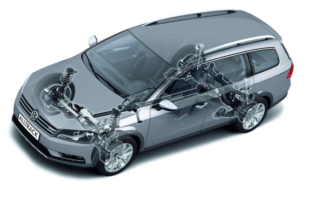 O czym jeszcze pomyśleli konstruktorzy przy projektowaniu napędu nowego Passata? Jeśli chodzi o jazdę po asfalcie, to aby auto prowadziło się stabilniej przy szybko pokonywanych zakrętach, wyposażono je w elektroniczną blokadę mechanizmu różnicowego XDS, która zapobiega uślizgowi wewnętrznego koła. W terenie natomiast możemy posiłkować się uruchomieniem trybu jazdy Offroad, działającym do prędkości 30 km/h. Jeden mały przycisk na konsoli środkowej zmienia ustawienia systemów bezpieczeństwa oraz tych wspierających kierowcę, a także sposób sterowania skrzynią DSG. Skutkuje to podwyższeniem progów interwałów systemu ABS, dzięki czemu podczas hamowania na luźnym podłożu, pod kołem tworzy się klin poprawiający skuteczność hamowania. Jednocześnie elektroniczne blokady mechanizmu różnicowego zaczynają reagować znacznie szybciej, uniemożliwiając w ten sposób poślizgi kół. Przy nachyleniu podłoża powyżej 10 stopni uruchamiany jest asystent zjazdu, utrzymujący zadaną prędkość i dezaktywujący aktywny tempomat. Pedał gazu delikatniej reaguje na nacisk, a punkty zmiany przełożenia przesuwają się w górę, abyśmy mogli wykorzystać wyższą prędkość obrotową silnika. Dodatkowo przy ustawieniu dźwigni DSG w tryb manualny, skrzynia nie zmienia automatycznie biegu na wyższy.