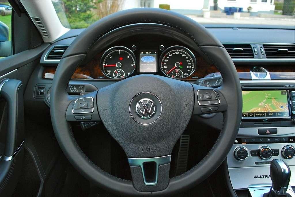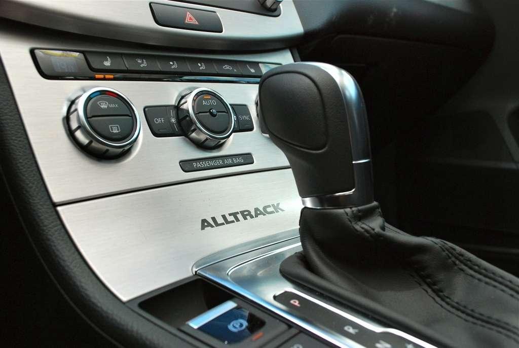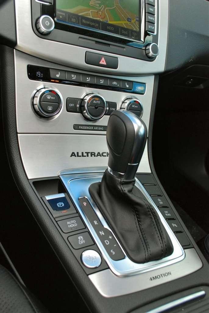 Środek auta praktycznie niczym nie różni się od zwykłego Passata. Gdyby nie napisy Alltrack na listwach progowych i popielniczce, mało kto zorientowałby się jaka to wersja. Warto wspomnieć, że kupując Alltracka dostajemy w standardzie siedzenia pokryte tkaniną w połączeniu z alcantarą, pedały z aluminiowymi nakładkami i automatyczną klimatyzację.