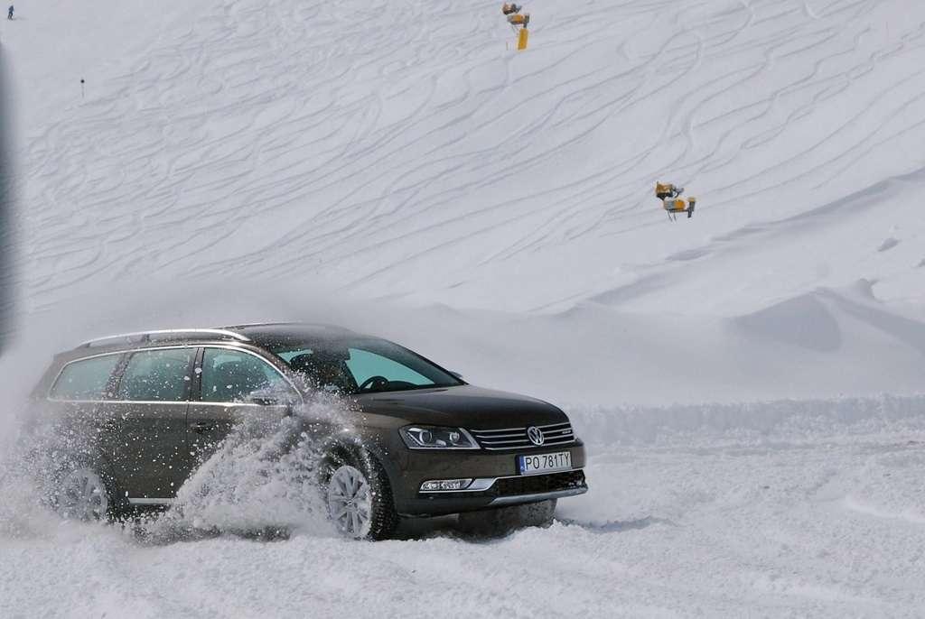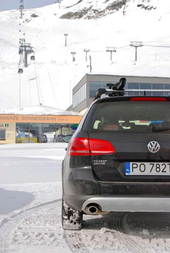 Kolejnego dnia mieliśmy możliwość wjechania samochodami na lodowiec Rettenbach (2670 m n.p.m.), gdzie przygotowane zostały odcinki specjalne na śniegu. Tam dopiero mogliśmy zweryfikować, na ile w ciężkich warunkach zimowych jest sobie w stanie poradzić Alltrack. Prawda jest taka, że każde auto w terenie warte jest tyle, ile opony, w które został wyposażony. My do dyspozycji mieliśmy zwykłe zimówki bez łańcuchów, więc czasem zdarzały się problemy z przebrnięciem przez głęboki śnieg, ale generalnie przyznaję, że jazda Alltrackiem w tych pięknych, zimowych okolicznościach to przyjemność i zabawa w czystej postaci.